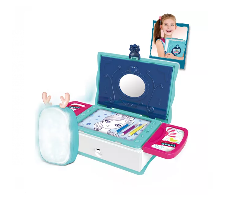 Tárolódoboz, 10 kép, 6 db színes filc, lámpa.