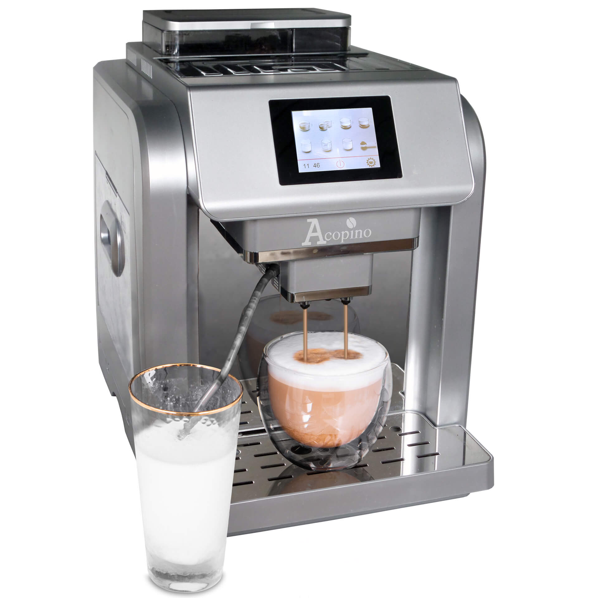 Élvezze az olasz kávékülönlegességeket, mint kedvenc olasz éttermében. Az Acopino fényűző, teljesen automata kávéfőzőjével egy darab Olaszországot hozhat otthoni konyhájába. Ez a teljesen felszerelt kávéfőző egy ujjmozdulattal nemcsak eszpresszót, hanem cappuccinót, latte macchiatót, forró tejet és tejhabot, valamint forró vizet készít a teához anélkül, hogy újra meg kellene mozgatnia a csészét - egyszerűen egyetlen érintéssel!