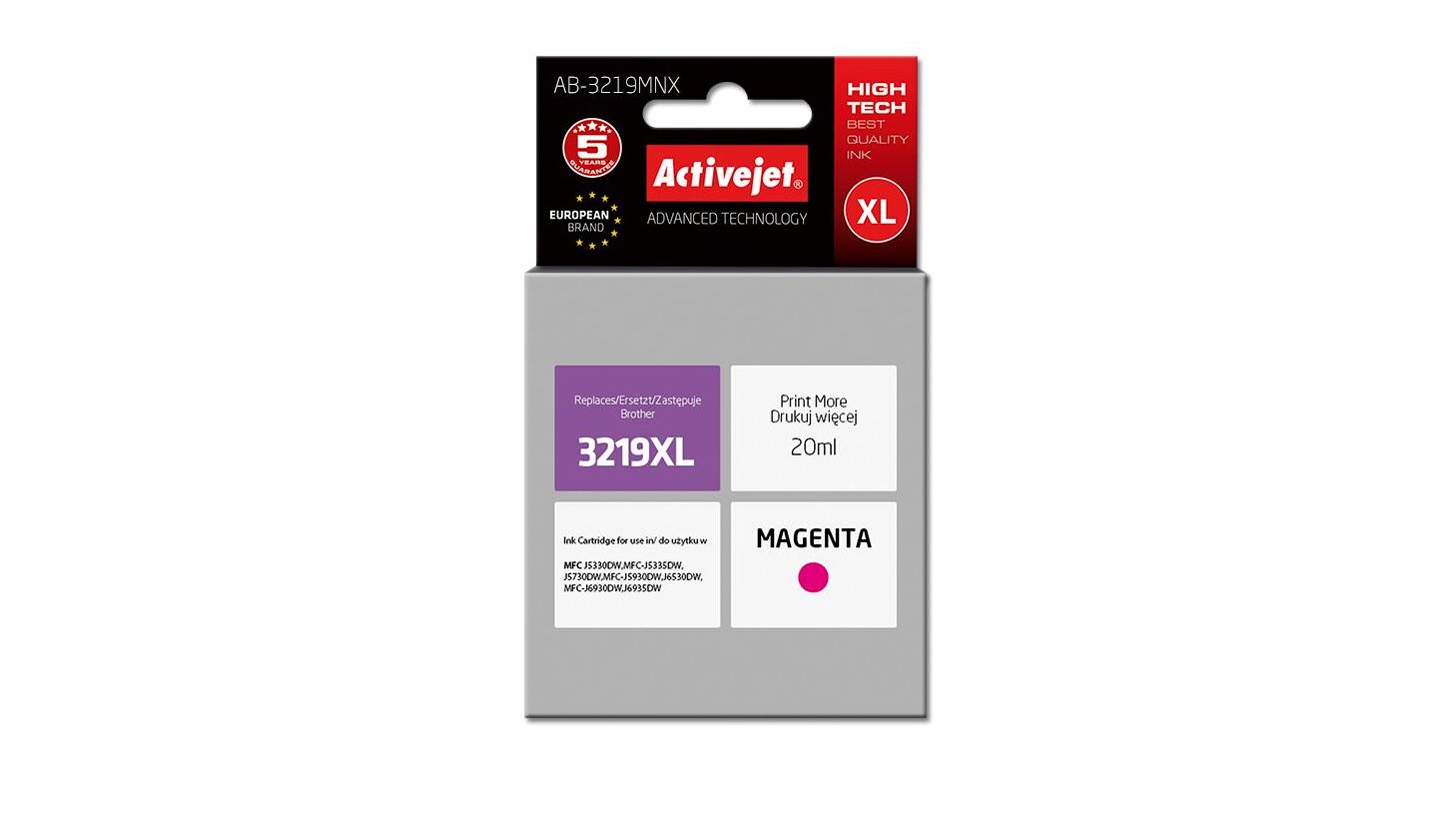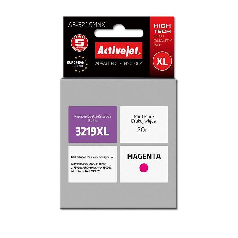 Az ActiveJet tintasugaras patronok tökéletes választás azoknak az ügyfeleknek, akik a legjobb nyomtatási minőséget igénylik. A tintapatronok a gyári mennyiségnél több tintát tartalmaznak, amellett ugyanolyan pontos színárnyalatot kínálnak, mint eredeti társaik. Az ActiveJet tintasugaras patronok a HP, a Lexmark, az Epson, a Brother és a Canon legnépszerűbb patronmodelljeinek kiváló alternatívájaként használhatók. A termékek kétféle gyártási eljárással készülének: a Premium (teljesen felújított alkatrészekből épült) és a Supreme (új alkatrészekből készült). Független és pártatlan külső ellenőrző szervezetek, mint a TUV Rheinland és BSI kísérik figyelemmel valamennyi ActiveJet patron gyártási folyamatát, ezalatt folyamatos minőség ellenőrzést végeznek. Az Activejet a lengyel tintasugaras nyomtató kellékek piacának vezetője. Tintapatronjaikkal professzionális nyomatok - fényképek, katalógusok, prezentációk, ajánlatok, stb. készíthetőek, emellett igényesen kivitelezett, lakkozott, UV álló akasztóval ellátott csomagolása tükrözi a minőségre való odafigyelést, kívül-belül egyaránt.