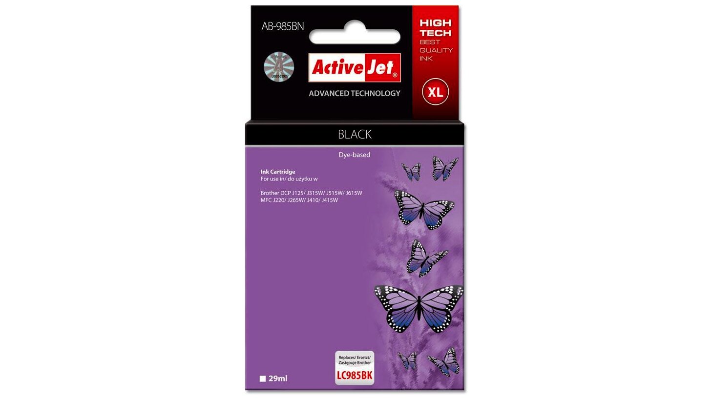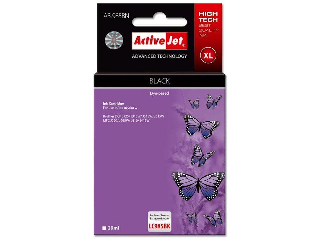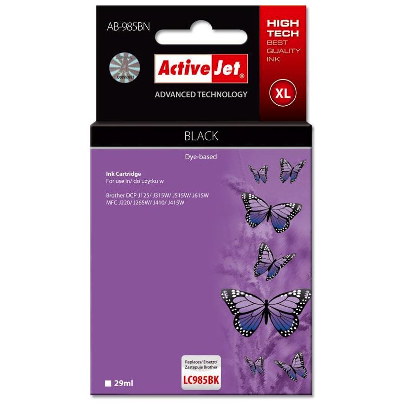 Az ActiveJet tintasugaras patronok tökéletes választás azoknak az ügyfeleknek, akik a legjobb nyomtatási minőséget igénylik. A tintapatronok a gyári mennyiségnél több tintát tartalmaznak, amellett ugyanolyan pontos színárnyalatot kínálnak, mint eredeti társaik. Az ActiveJet tintasugaras patronok a HP, a Lexmark, az Epson, a Brother és a Canon legnépszerűbb patronmodelljeinek kiváló alternatívájaként használhatók. Független és pártatlan külső ellenőrző szervezetek, mint a TUV Rheinland és BSI kísérik figyelemmel valamennyi ActiveJet patron gyártási folyamatát, ezalatt folyamatos minőség ellenőrzést végeznek. Az Activejet a lengyel tintasugaras nyomtató kellékek piacának vezetője. Tintapatronjaikkal professzionális nyomatok - fényképek, katalógusok, prezentációk, ajánlatok, stb. készíthetőek, emellett igényesen kivitelezett, lakkozott, UV álló akasztóval ellátott csomagolása tükrözi a minőségre való odafigyelést, kívül-belül egyaránt.