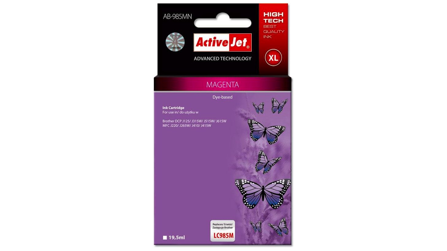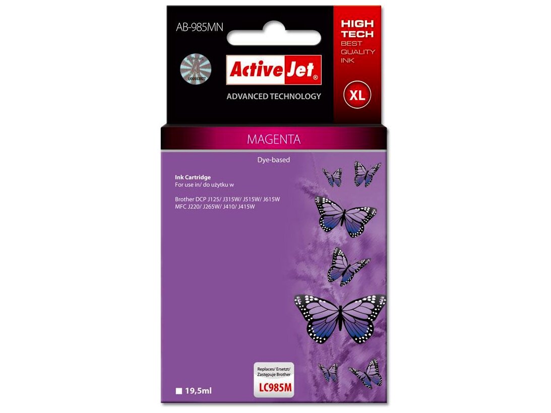 Az ActiveJet tintasugaras patronok tökéletes választás azoknak az ügyfeleknek, akik a legjobb nyomtatási minőséget igénylik. A tintapatronok a gyári mennyiségnél több tintát tartalmaznak, amellett ugyanolyan pontos színárnyalatot kínálnak, mint eredeti társaik. Az ActiveJet tintasugaras patronok a HP, a Lexmark, az Epson, a Brother és a Canon legnépszerűbb patronmodelljeinek kiváló alternatívájaként használhatók. Független és pártatlan külső ellenőrző szervezetek, mint a TUV Rheinland és BSI kísérik figyelemmel valamennyi ActiveJet patron gyártási folyamatát, ezalatt folyamatos minőség ellenőrzést végeznek. Az Activejet a lengyel tintasugaras nyomtató kellékek piacának vezetője. Tintapatronjaikkal professzionális nyomatok - fényképek, katalógusok, prezentációk, ajánlatok, stb. készíthetőek, emellett igényesen kivitelezett, lakkozott, UV álló akasztóval ellátott csomagolása tükrözi a minőségre való odafigyelést, kívül-belül egyaránt.