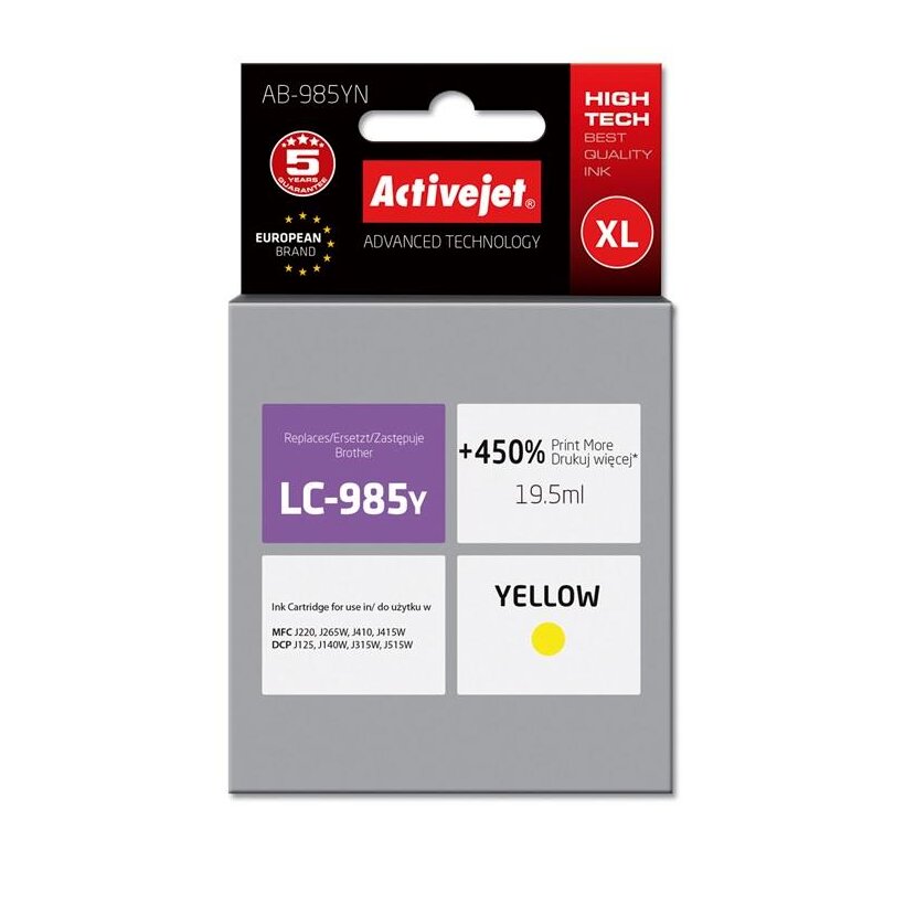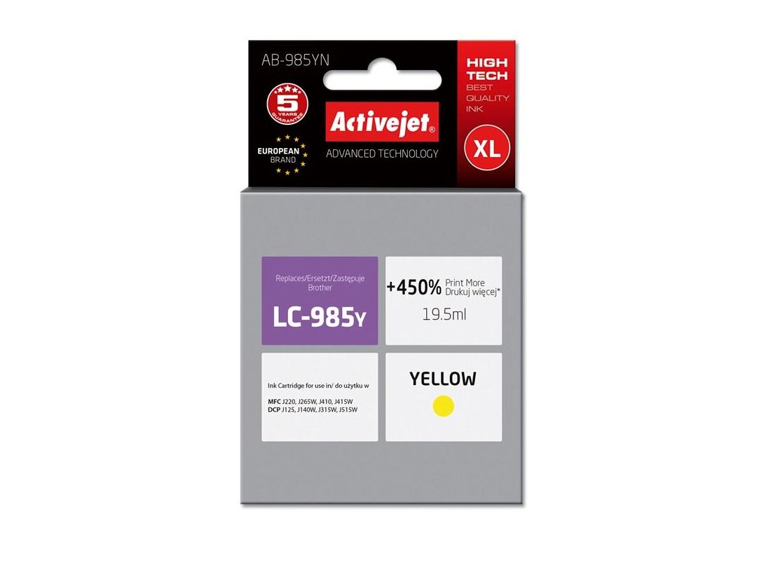 Az ActiveJet tintasugaras patronok tökéletes választás azoknak az ügyfeleknek, akik a legjobb nyomtatási minőséget igénylik. A tintapatronok a gyári mennyiségnél több tintát tartalmaznak, amellett ugyanolyan pontos színárnyalatot kínálnak, mint eredeti társaik. Az ActiveJet tintasugaras patronok a HP, a Lexmark, az Epson, a Brother és a Canon legnépszerűbb patronmodelljeinek kiváló alternatívájaként használhatók. Független és pártatlan külső ellenőrző szervezetek, mint a TUV Rheinland és BSI kísérik figyelemmel valamennyi ActiveJet patron gyártási folyamatát, ezalatt folyamatos minőség ellenőrzést végeznek. Az Activejet a lengyel tintasugaras nyomtató kellékek piacának vezetője. Tintapatronjaikkal professzionális nyomatok - fényképek, katalógusok, prezentációk, ajánlatok, stb. készíthetőek, emellett igényesen kivitelezett, lakkozott, UV álló akasztóval ellátott csomagolása tükrözi a minőségre való odafigyelést, kívül-belül egyaránt.