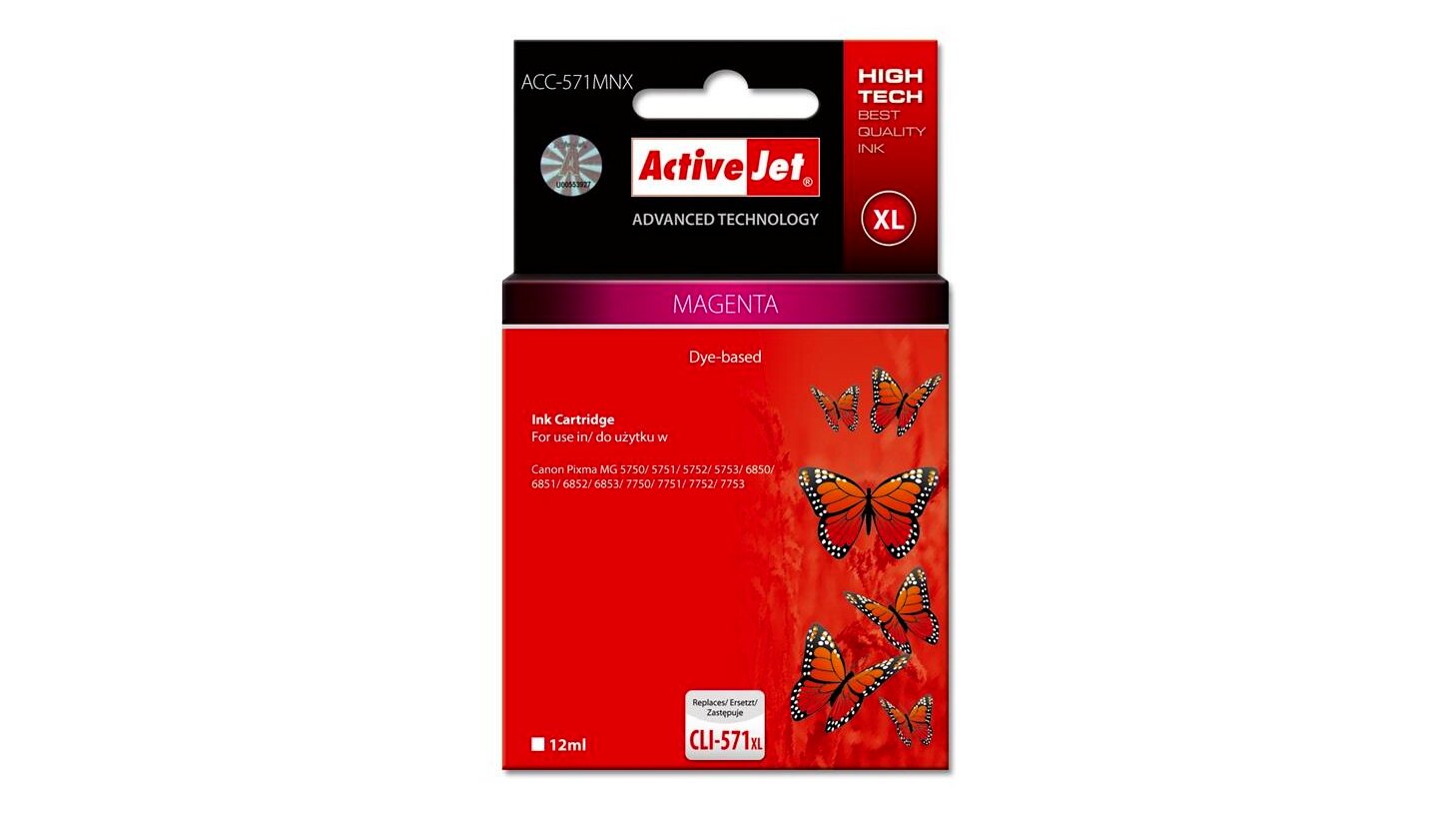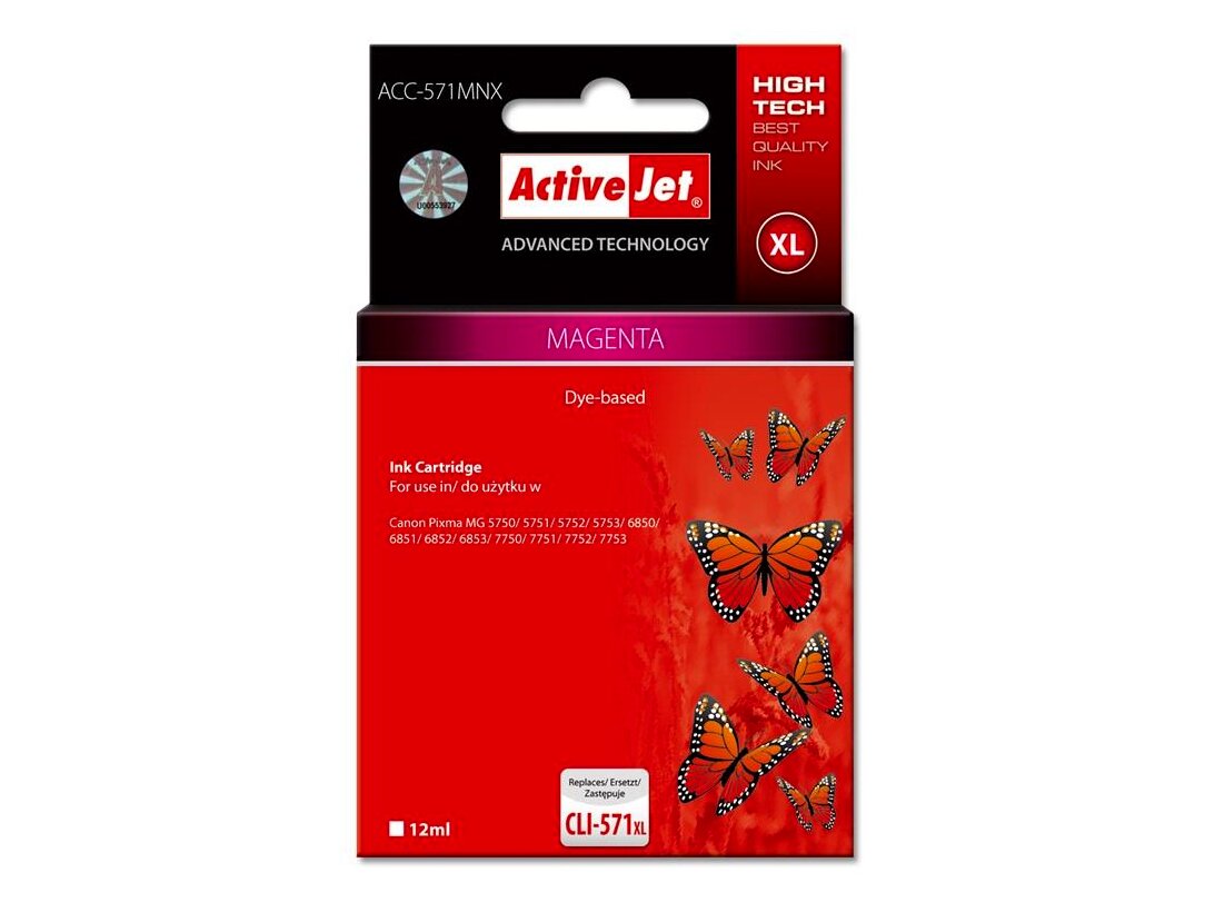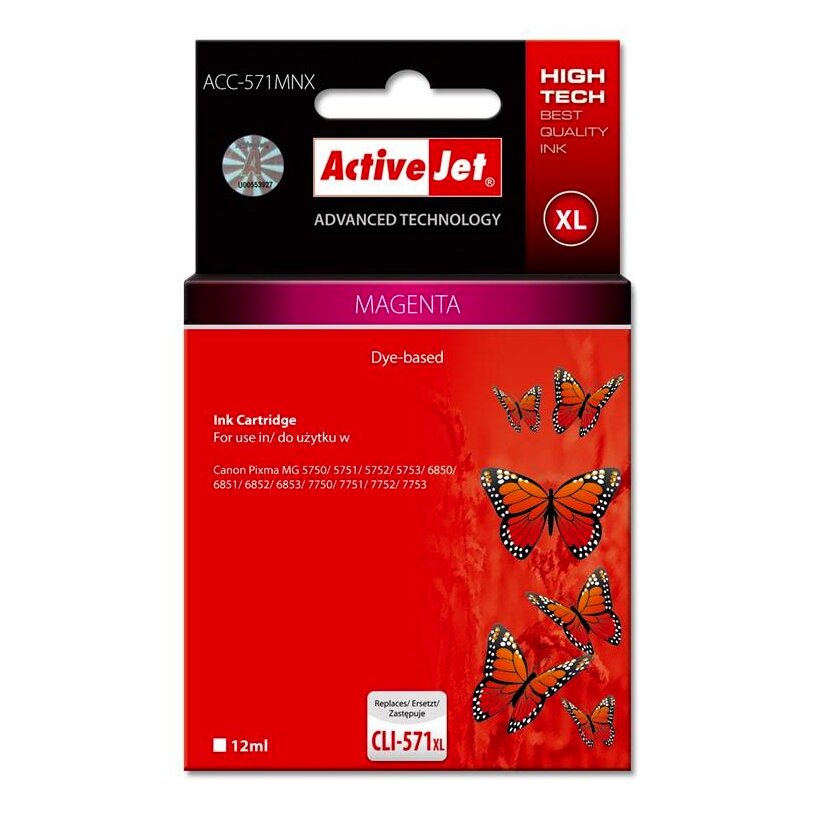 Az ActiveJet tintasugaras patronok tökéletes választás azoknak az ügyfeleknek, akik a legjobb nyomtatási minőséget igénylik. A tintapatronok a gyári mennyiségnél több tintát tartalmaznak, amellett ugyanolyan pontos színárnyalatot kínálnak, mint eredeti társaik. Az ActiveJet tintasugaras patronok a HP, a Lexmark, az Epson, a Brother és a Canon legnépszerűbb patronmodelljeinek kiváló alternatívájaként használhatók. Független és pártatlan külső ellenőrző szervezetek, mint a TUV Rheinland és BSI kísérik figyelemmel valamennyi ActiveJet patron gyártási folyamatát, ezalatt folyamatos minőség ellenőrzést végeznek. Az Activejet a lengyel tintasugaras nyomtató kellékek piacának vezetője. Tintapatronjaikkal professzionális nyomatok - fényképek, katalógusok, prezentációk, ajánlatok, stb. készíthetőek, emellett igényesen kivitelezett, lakkozott, UV álló akasztóval ellátott csomagolása tükrözi a minőségre való odafigyelést, kívül-belül egyaránt.