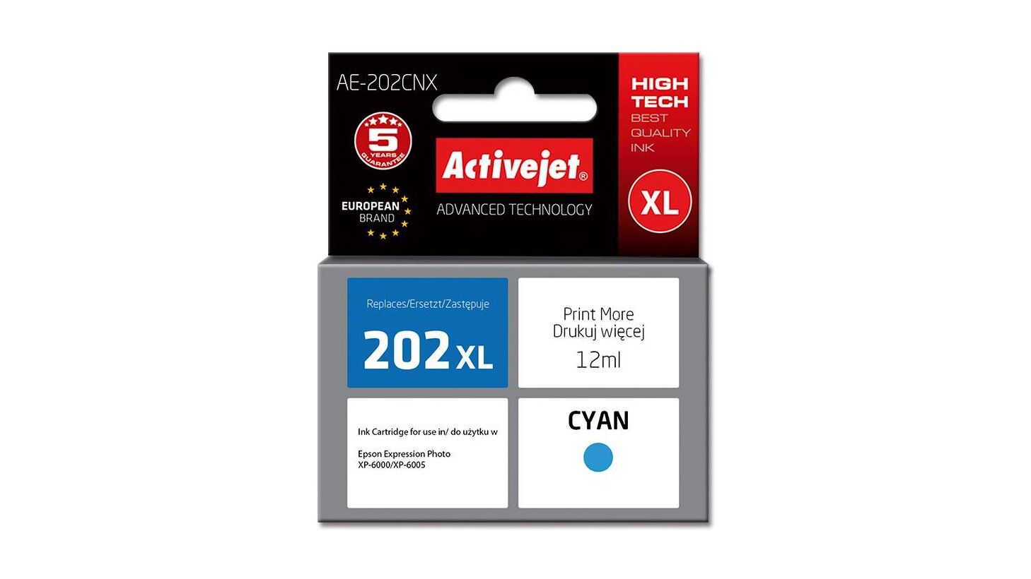 Az ActiveJet tintasugaras patronok tökéletes választás azoknak az ügyfeleknek, akik a legjobb nyomtatási minőséget igénylik. A tintapatronok a gyári mennyiségnél több tintát tartalmaznak, amellett ugyanolyan pontos színárnyalatot kínálnak, mint eredeti társaik. Az ActiveJet tintasugaras patronok a HP, a Lexmark, az Epson, a Brother és a Canon legnépszerűbb patronmodelljeinek kiváló alternatívájaként használhatók. Független és pártatlan külső ellenőrző szervezetek, mint a TUV Rheinland és BSI kísérik figyelemmel valamennyi ActiveJet patron gyártási folyamatát, ezalatt folyamatos minőség ellenőrzést végeznek. Az Activejet a lengyel tintasugaras nyomtató kellékek piacának vezetője. Tintapatronjaikkal professzionális nyomatok - fényképek, katalógusok, prezentációk, ajánlatok, stb. készíthetőek, emellett igényesen kivitelezett, lakkozott, UV álló akasztóval ellátott csomagolása tükrözi a minőségre való odafigyelést, kívül-belül egyaránt.