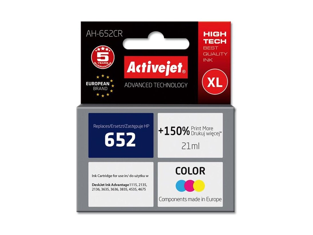 Az ActiveJet tintasugaras patronok tökéletes választás azoknak az ügyfeleknek, akik a legjobb nyomtatási minőséget igénylik. A tintapatronok a gyári mennyiségnél több tintát tartalmaznak, amellett ugyanolyan pontos színárnyalatot kínálnak, mint eredeti társaik. Az ActiveJet tintasugaras patronok a HP, a Lexmark, az Epson, a Brother és a Canon legnépszerűbb patronmodelljeinek kiváló alternatívájaként használhatók. A termékek kétféle gyártási eljárással készülének: a Premium (teljesen felújított alkatrészekből épült) és a Supreme (új alkatrészekből készült). Független és pártatlan külső ellenőrző szervezetek, mint a TUV Rheinland és BSI kísérik figyelemmel valamennyi ActiveJet patron gyártási folyamatát, ezalatt folyamatos minőség ellenőrzést végeznek. Az Activejet a lengyel tintasugaras nyomtató kellékek piacának vezetője. Tintapatronjaikkal professzionális nyomatok - fényképek, katalógusok, prezentációk, ajánlatok, stb. készíthetőek, emellett igényesen kivitelezett, lakkozott, UV álló akasztóval ellátott csomagolása tükrözi a minőségre való odafigyelést, kívül-belül egyaránt.