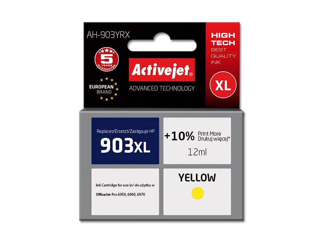 Az ActiveJet tintasugaras patronok tökéletes választás azoknak az ügyfeleknek, akik a legjobb nyomtatási minőséget igénylik. A tintapatronok a gyári mennyiségnél több tintát tartalmaznak, amellett ugyanolyan pontos színárnyalatot kínálnak, mint eredeti társaik. Az ActiveJet tintasugaras patronok a HP, a Lexmark, az Epson, a Brother és a Canon legnépszerűbb patronmodelljeinek kiváló alternatívájaként használhatók. A termékek kétféle gyártási eljárással készülének: a Premium (teljesen felújított alkatrészekből épült) és a Supreme (új alkatrészekből készült). Független és pártatlan külső ellenőrző szervezetek, mint a TUV Rheinland és BSI kísérik figyelemmel valamennyi ActiveJet patron gyártási folyamatát, ezalatt folyamatos minőség ellenőrzést végeznek. Az Activejet a lengyel tintasugaras nyomtató kellékek piacának vezetője. Tintapatronjaikkal professzionális nyomatok - fényképek, katalógusok, prezentációk, ajánlatok, stb. készíthetőek, emellett igényesen kivitelezett, lakkozott, UV álló akasztóval ellátott csomagolása tükrözi a minőségre való odafigyelést, kívül-belül egyaránt.
