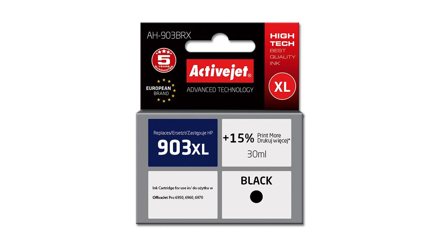 Az ActiveJet tintasugaras patronok tökéletes választás azoknak az ügyfeleknek, akik a legjobb nyomtatási minőséget igénylik. A tintapatronok a gyári mennyiségnél több tintát tartalmaznak, amellett ugyanolyan pontos színárnyalatot kínálnak, mint eredeti társaik. Az ActiveJet tintasugaras patronok a HP, a Lexmark, az Epson, a Brother és a Canon legnépszerűbb patronmodelljeinek kiváló alternatívájaként használhatók. A termékek kétféle gyártási eljárással készülének: a Premium (teljesen felújított alkatrészekből épült) és a Supreme (új alkatrészekből készült). Független és pártatlan külső ellenőrző szervezetek, mint a TUV Rheinland és BSI kísérik figyelemmel valamennyi ActiveJet patron gyártási folyamatát, ezalatt folyamatos minőség ellenőrzést végeznek. Az Activejet a lengyel tintasugaras nyomtató kellékek piacának vezetője. Tintapatronjaikkal professzionális nyomatok - fényképek, katalógusok, prezentációk, ajánlatok, stb. készíthetőek, emellett igényesen kivitelezett, lakkozott, UV álló akasztóval ellátott csomagolása tükrözi a minőségre való odafigyelést, kívül-belül egyaránt.