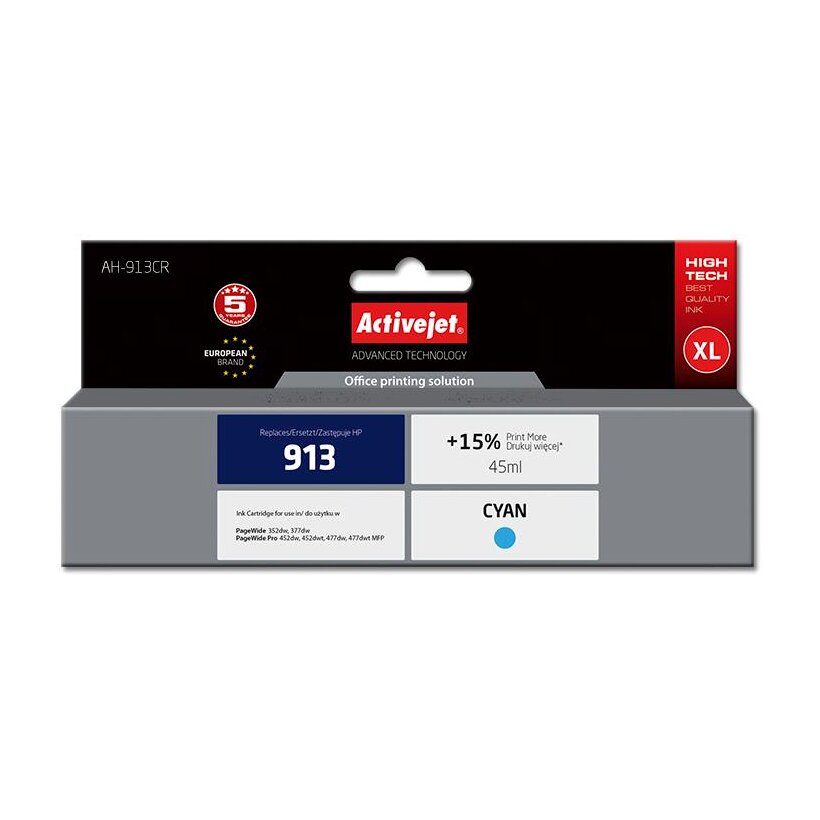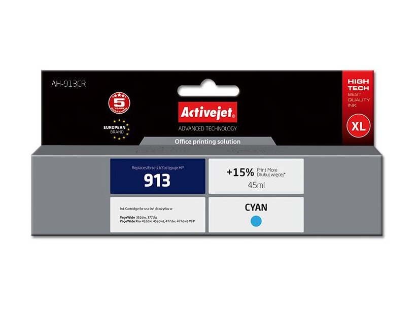 Az ActiveJet tintasugaras patronok tökéletes választás azoknak az ügyfeleknek, akik a legjobb nyomtatási minőséget igénylik. A tintapatronok a gyári mennyiségnél több tintát tartalmaznak, amellett ugyanolyan pontos színárnyalatot kínálnak, mint eredeti társaik. Az ActiveJet tintasugaras patronok a HP, a Lexmark, az Epson, a Brother és a Canon legnépszerűbb patronmodelljeinek kiváló alternatívájaként használhatók. A termékek kétféle gyártási eljárással készülének: a Premium (teljesen felújított alkatrészekből épült) és a Supreme (új alkatrészekből készült). Független és pártatlan külső ellenőrző szervezetek, mint a TUV Rheinland és BSI kísérik figyelemmel valamennyi ActiveJet patron gyártási folyamatát, ezalatt folyamatos minőség ellenőrzést végeznek. Az Activejet a lengyel tintasugaras nyomtató kellékek piacának vezetője. Tintapatronjaikkal professzionális nyomatok - fényképek, katalógusok, prezentációk, ajánlatok, stb. készíthetőek, emellett igényesen kivitelezett, lakkozott, UV álló akasztóval ellátott csomagolása tükrözi a minőségre való odafigyelést, kívül-belül egyaránt.