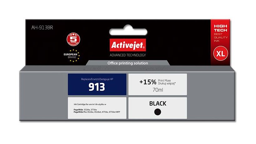 Az ActiveJet tintasugaras patronok tökéletes választás azoknak az ügyfeleknek, akik a legjobb nyomtatási minőséget igénylik. A tintapatronok a gyári mennyiségnél több tintát tartalmaznak, amellett ugyanolyan pontos színárnyalatot kínálnak, mint eredeti társaik. Az ActiveJet tintasugaras patronok a HP, a Lexmark, az Epson, a Brother és a Canon legnépszerűbb patronmodelljeinek kiváló alternatívájaként használhatók. A termékek kétféle gyártási eljárással készülének: a Premium (teljesen felújított alkatrészekből épült) és a Supreme (új alkatrészekből készült). Független és pártatlan külső ellenőrző szervezetek, mint a TUV Rheinland és BSI kísérik figyelemmel valamennyi ActiveJet patron gyártási folyamatát, ezalatt folyamatos minőség ellenőrzést végeznek. Az Activejet a lengyel tintasugaras nyomtató kellékek piacának vezetője. Tintapatronjaikkal professzionális nyomatok - fényképek, katalógusok, prezentációk, ajánlatok, stb. készíthetőek, emellett igényesen kivitelezett, lakkozott, UV álló akasztóval ellátott csomagolása tükrözi a minőségre való odafigyelést, kívül-belül egyaránt.