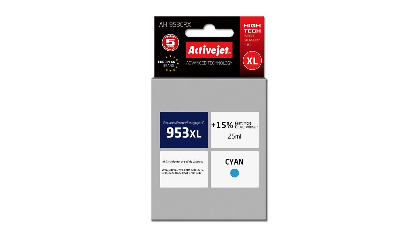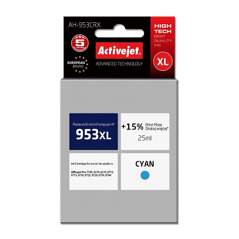 Az ActiveJet tintasugaras patronok tökéletes választás azoknak az ügyfeleknek, akik a legjobb nyomtatási minőséget igénylik. A tintapatronok a gyári mennyiségnél több tintát tartalmaznak, amellett ugyanolyan pontos színárnyalatot kínálnak, mint eredeti társaik. Az ActiveJet tintasugaras patronok a HP, a Lexmark, az Epson, a Brother és a Canon legnépszerűbb patronmodelljeinek kiváló alternatívájaként használhatók. A termékek kétféle gyártási eljárással készülének: a Premium (teljesen felújított alkatrészekből épült) és a Supreme (új alkatrészekből készült). Független és pártatlan külső ellenőrző szervezetek, mint a TUV Rheinland és BSI kísérik figyelemmel valamennyi ActiveJet patron gyártási folyamatát, ezalatt folyamatos minőség ellenőrzést végeznek. Az Activejet a lengyel tintasugaras nyomtató kellékek piacának vezetője. Tintapatronjaikkal professzionális nyomatok - fényképek, katalógusok, prezentációk, ajánlatok, stb. készíthetőek, emellett igényesen kivitelezett, lakkozott, UV álló akasztóval ellátott csomagolása tükrözi a minőségre való odafigyelést, kívül-belül egyaránt.