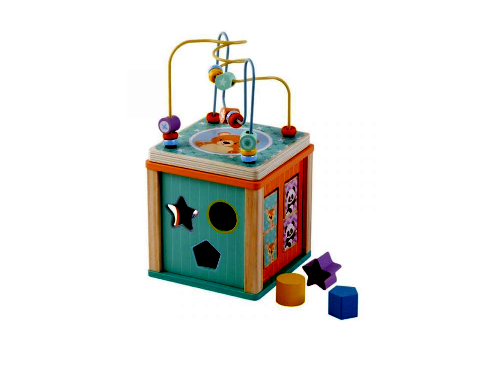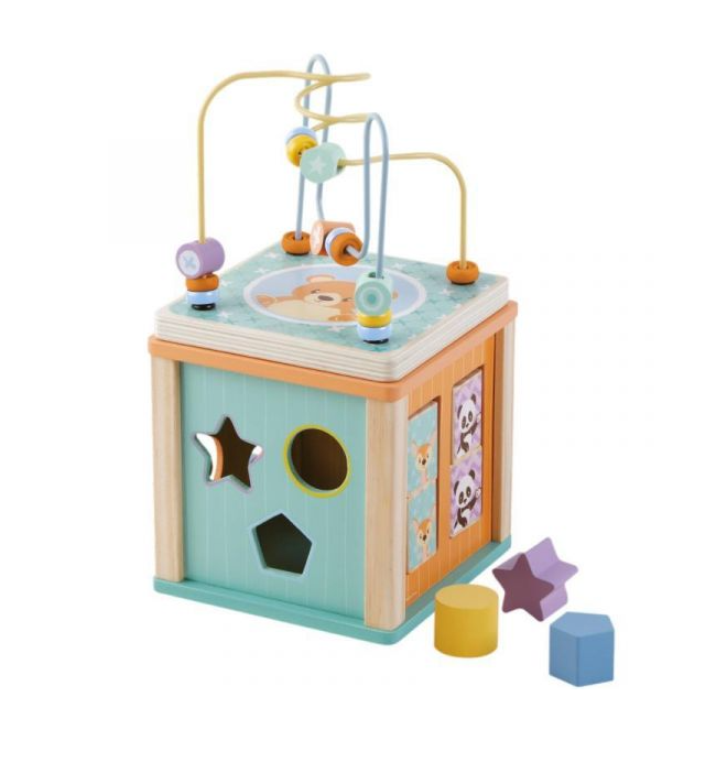 Az Activity Cube játszva fejleszti a kicsik készségeit. A kocka minden oldalán más-más feladatok vannak. Formabedobó, tekerhető fa fogaskerekek, forgatható lapocskák és hullámos sínpálya, tetején pedig egy golyóvezető játék kapott helyet. A fa készségfejlesztő kocka édes kis állatokkal van dekorálva, melyek további játékra ösztönzik a kicsiket. A termék mérete: 16 x 16 x 31 cm.