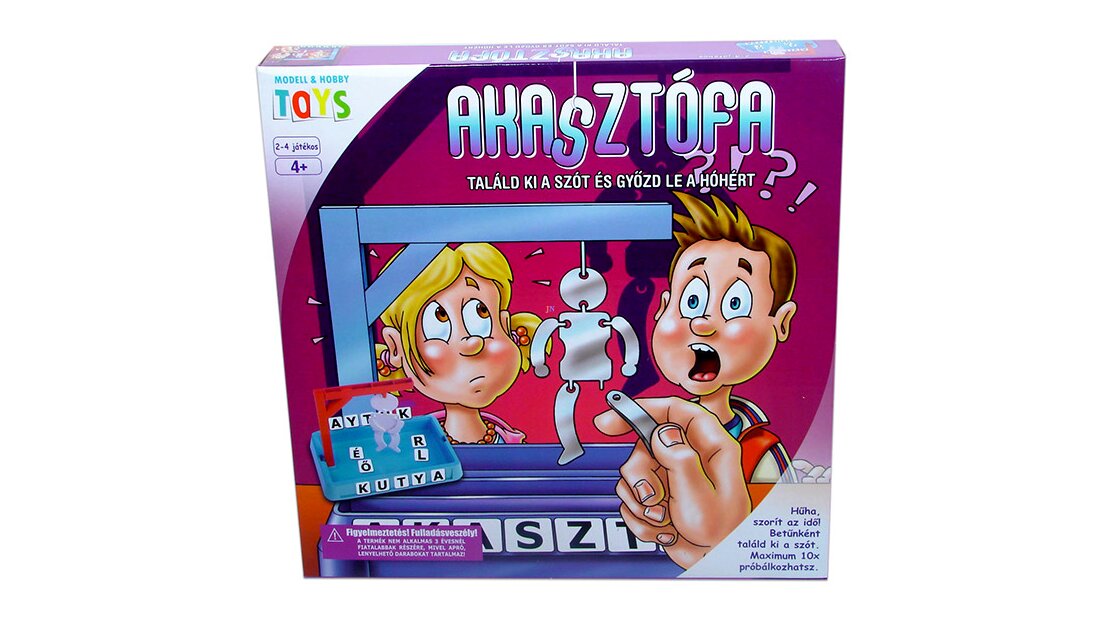 Szorít az idő! Találjátok ki betűnként a szót, de csak 10 alkalommal próbálkozhattok, különben a kis figura lógni fog. Találjátok ki a szót, mentsétek meg a kis fém embert, és győzzétek le a hóhért! Az Akasztófa társasjáték hordozható, könnyen összecsukható, így kis helyen is könnyen elfér.