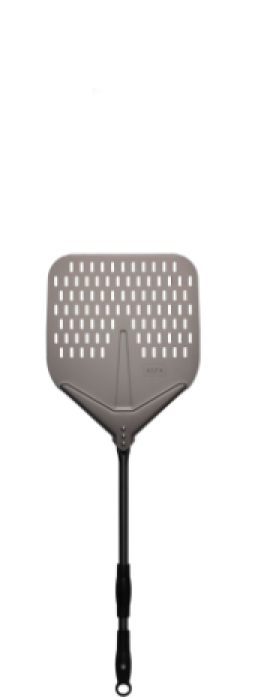Ez a pizza lapát, amelyet az Alfa fejlesztett ki, nélkülözhetetlen eszköz a pizza készítéséhez. A lapát pengéje perforált, így a felesleges liszt lepereghet a pizza alapról. Így elkerülheti, hogy az égett lisztre süsse a pizzát, amely kellemetlen, keserű ízt okoz.