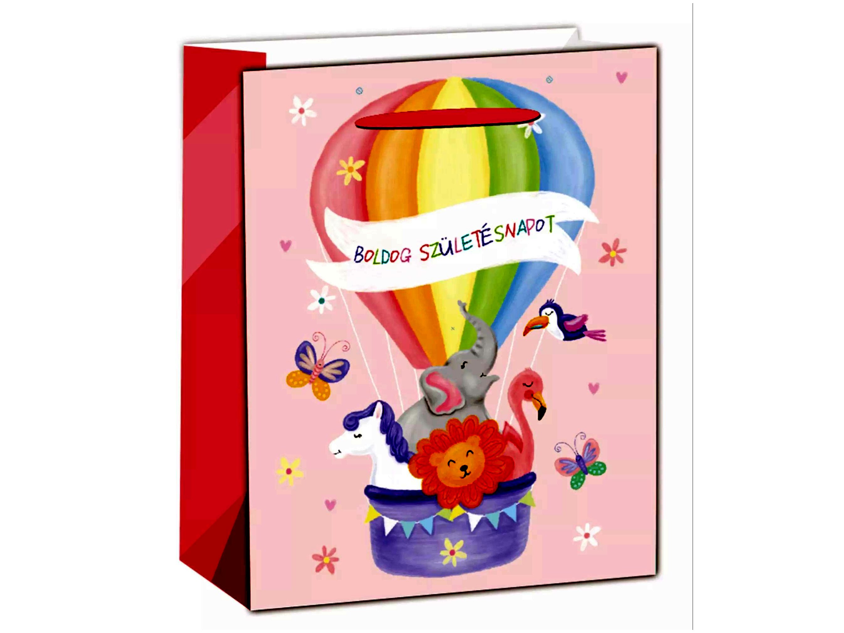 Dobd fel az ünneplést ezzel a vidám és színes ajándéktasakkal, amely hőlégballonba bújtatott aranyos állatokkal köszönti az ünnepeltet! Ez az ajándékzacskó nem csak praktikus, de környezetbarát is, hiszen többször is felhasználható, így kevésbé terheli a környezetet, mint a hagyományos csomagolópapír.