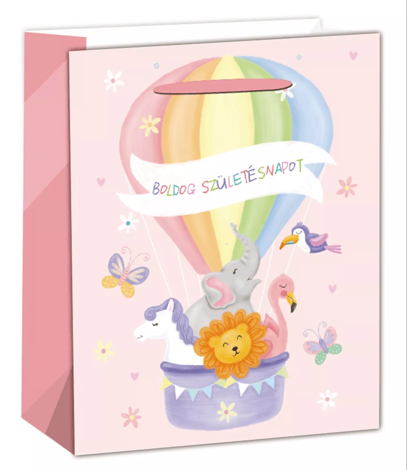 Varázsold különlegessé az ünnepet a hőlégballonban repkedő állatokkal díszített, "Boldog szülinapot" feliratos szalagfüles ajándéktasakkal! Ez a pink és vidám mintás ajándékzacskó garantáltan mosolyt csal az arcokra. A szalagfüllel ellátott kialakítás könnyű hordozhatóságot biztosít, miközben a praktikus mérete lehetővé teszi, hogy szinte bármilyen ajándékot könnyedén becsomagolhass.