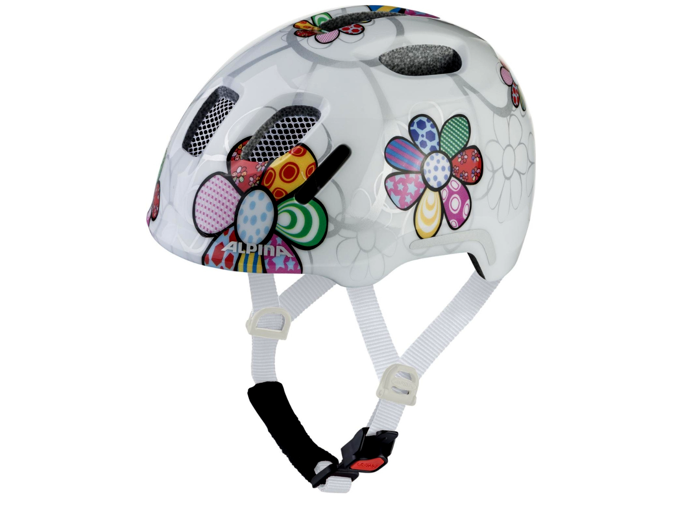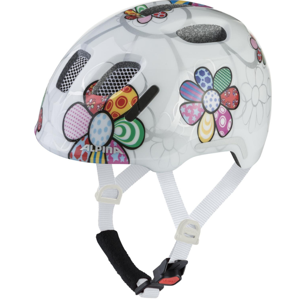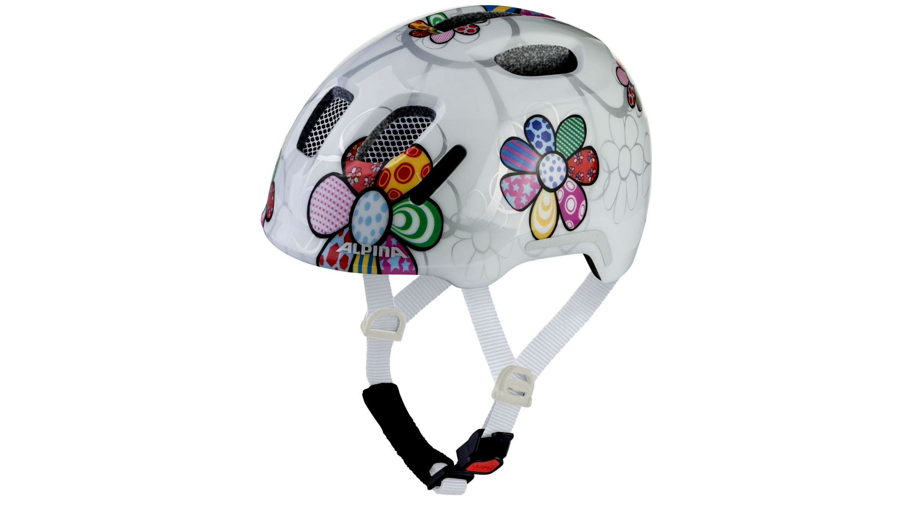 • Gyerekbarát dizájn: fehér alapszín, virágmintás dekor és fényes felület, amelyet a gyerekek szívesen hordanak – így a sisak nem kötelező teher, hanem menő kiegészítő.