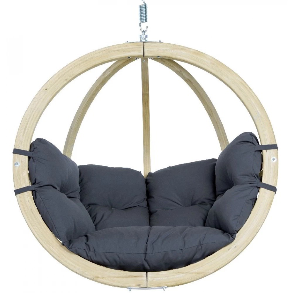 A Globo szék egy nemes függőszék, amely időjárásálló, kezelt lucfenyőből készült. A kiváló minőségű réteges ragasztás biztosítja a legnagyobb stabilitást és biztonságot. Az extra vastag, víztaszító és extra gyorsan száradó kárpit tökéletes pihenést biztosít. A rendkívül tartós szövethuzat puha, mint a pamut, magas fény- és időjárásállóságú (fényállóság 7/8), víztaszító, penészálló, szennyeződésálló és könnyen tisztítható. A Globo széket spirálrugóval szállítjuk, és opcionálisan kombinálható a "Globo Stand" kerettel (nem tartozék). Minden felhasznált nyersanyag Európából származik, és ott környezetbarát módon került feldolgozásra.