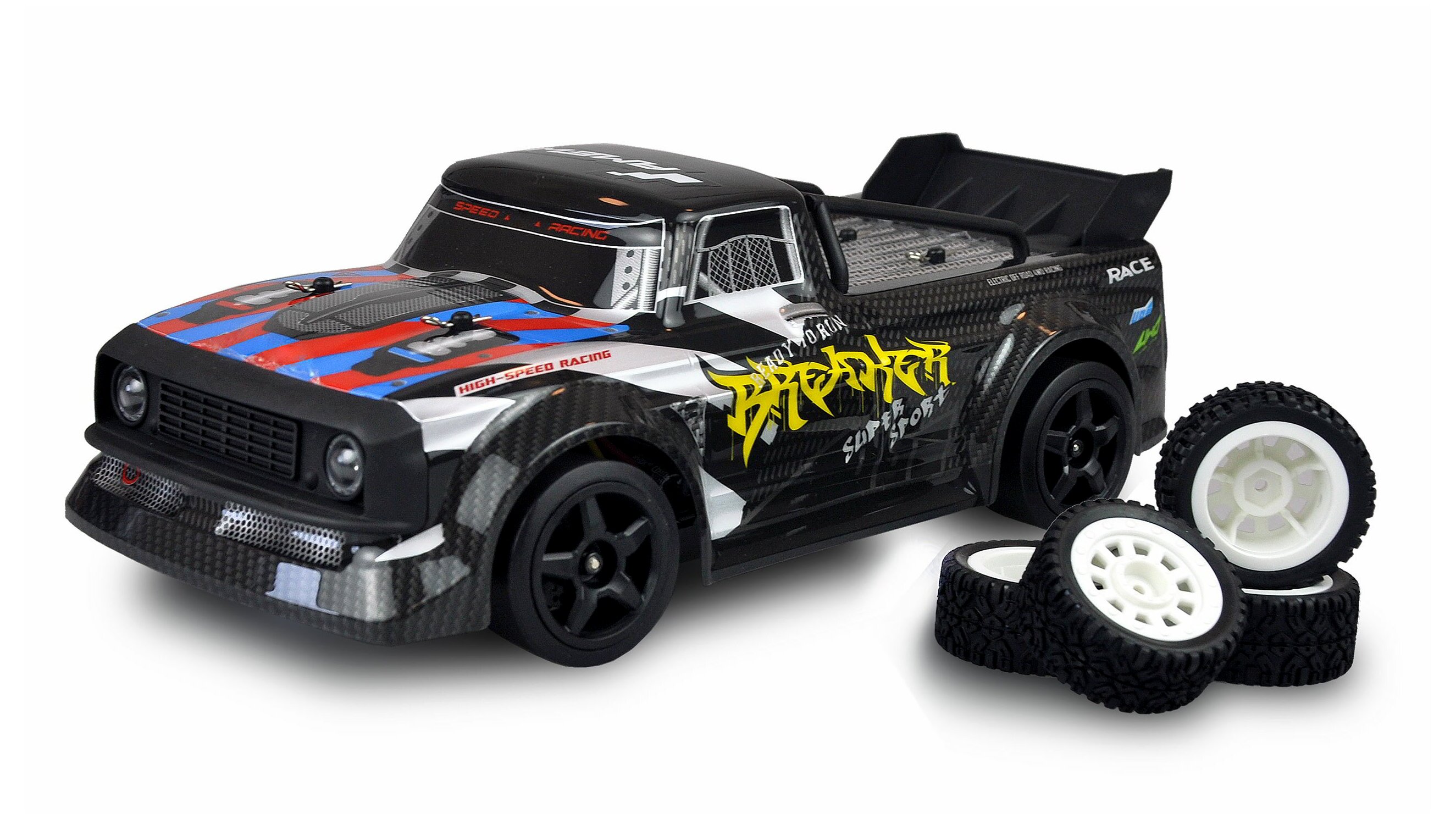 A Sport Car Breaker ötvözi a menő megjelenést, a kifinomult technológiát egy rendkívül hatékony giroszkópos rendszerrel és az elegáns drifteléshez elegendő erővel párosítva. Akár az úton, a pályán vagy a nappali padlóján - ez az 1:16 méretarányú modell bármilyen terepen megbirkózik vele. Az érzékeny 2,4 GHz-es távirányító nagyon közvetlen vezetési érzést biztosít. A gyors és erős kormányszervó szintén precíz kezelhetőséget biztosít, és a nagy teljesítményű 4WD meghajtás a nagy akkumulátorral (7,4V Li-Ion 1200mAh) együtt hosszú vezetési időt tesz lehetővé kb. 30-35km/h végsebesség mellett. A beépített giroszkóp minden helyzetben támogatja és tisztán a pályán tartja a Drift Sport Car Breaker-t. Egy kis kiegészítésként ez a modell különböző világítási lehetőségekkel lett felszerelve, amelyek a jeladóval állíthatók. Három különböző típusú LED-világítás választható, így az elülső rész minden alkalommal más-más látványt nyújt. A modellt már gyárilag jó golyóscsapágyakkal, fém CVD meghajtótengelyekkel és precíz futóművel szerelték fel. Bónuszként az utcai gumiabroncsok is benne vannak. Ezeket egyszerűen fel lehet szerelni a szerelt driftgumik helyett, hogy tisztán országúti autóként mutatkozhassunk be.