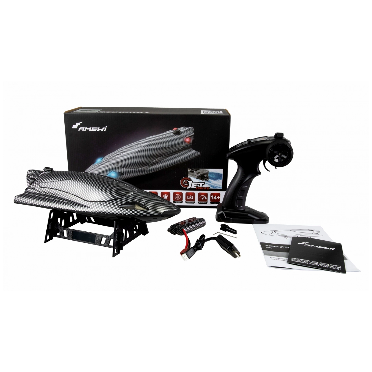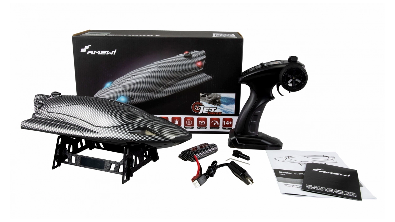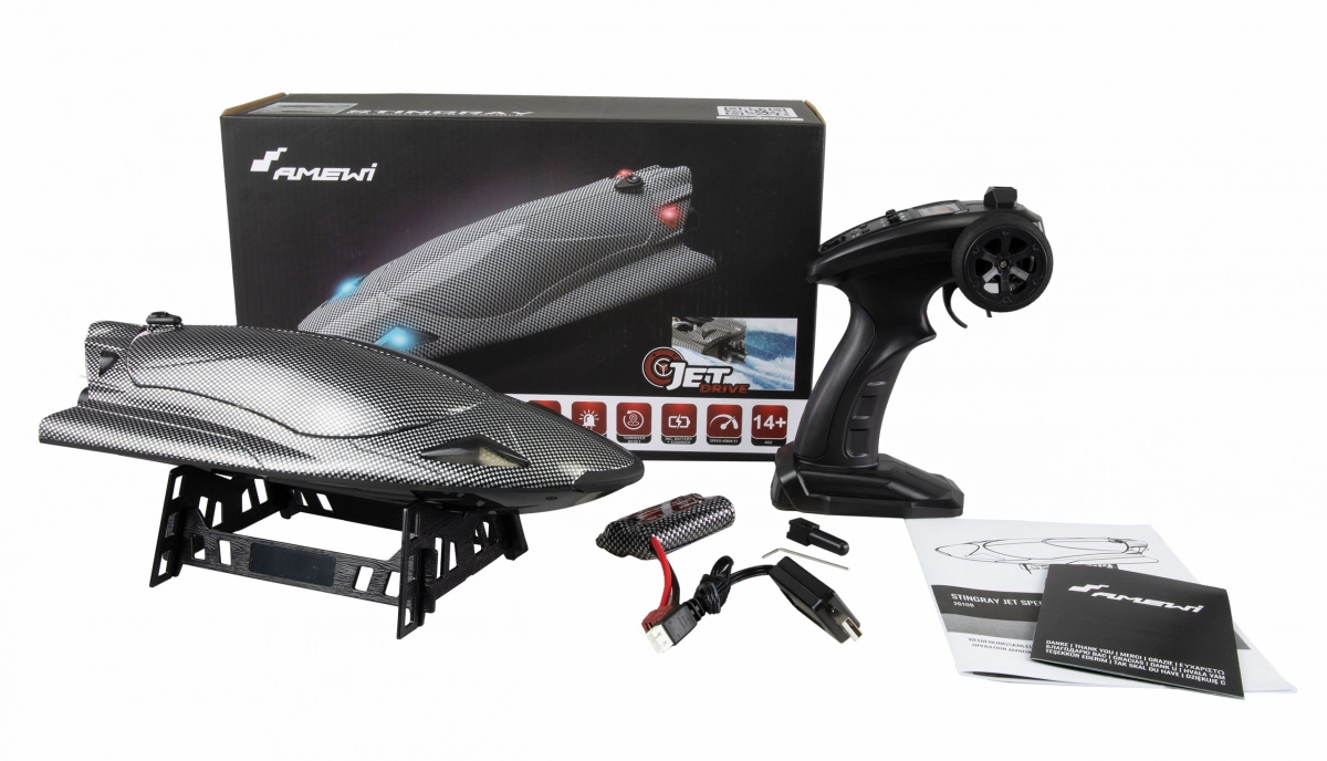 A 335 mm hosszú, rájára emlékeztető versenyhajó sugárhajtásának köszönhetően sokoldalúan használható sekély vagy mély vízben. A hagyományos légcsavaros hajtásokkal ellentétben a sugárhajtás a (védőrács által védett) hajótest alatt szívja be a vizet, és hátul összenyomott sugárként löki ki, ami hatalmas hajtóerőt és erős gyorsulást hoz létre. Akár egy elöntött rét is vezetési felületként szolgálhat, és könnyen áthajthatók az olyan akadályok, mint a botok vagy apró kövek.