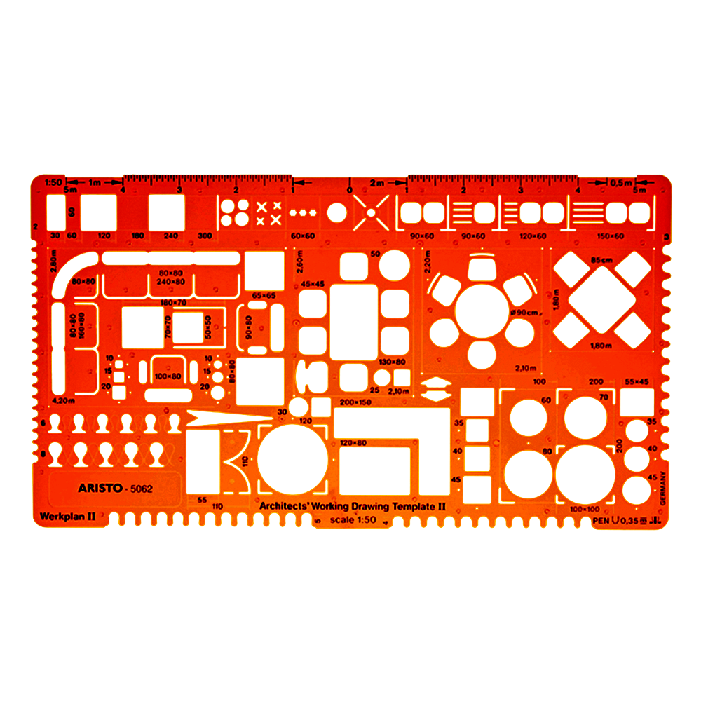 Az Aristo GEO5062 berendezési sablon segítségével precíz és részletgazdag terveket készíthet. Az átlátszó narancssárga színű, szintetikus anyagból készült sablon kiváló kontrasztot biztosít, így könnyen áttekinthető és használható.
