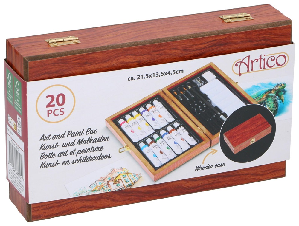 Az Artico 20 részes művész szett tökéletes választás kezdők és haladók számára egyaránt. A gyönyörűen megmunkált és tartós fadoboz minden szükséges eszközt tartalmaz, hogy a lehető legjobban kiélvezhesd a festés folyamatát.