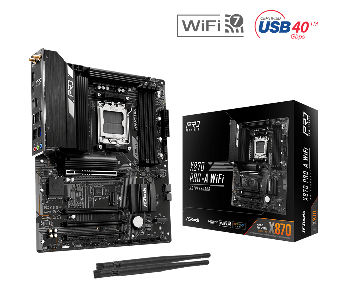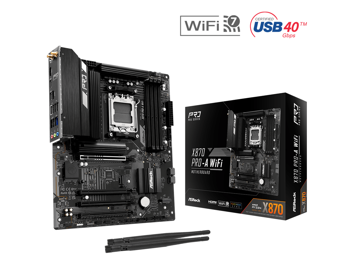Az ASRock X870 Pro-A WiFi alaplap támogatja az AMD Socket AM5 Ryzen™ 9000, 8000 és 7000 sorozatú processzorokat, 16+2+1 Power Phase, 80A Dr.MOS-technológiával a VCore+SOC+MISC számára, 4 x DDR5 DIMMs, támogatja a Dual Channel, akár 8000+ (OC) módot, 1 PCIe 5.0 x16, 3 PCIe 4.0 x16 kártyahelyet. Grafikuskimeneti lehetőségek: 1 HDMI, 2 USB4 Type-C. Audio: Realtek ALC897 7.1 CH HD Audio Codec, Nahimic Audio. További csatlakozók: 1 Blazing M.2 (PCIe Gen5x4), 1 Hyper M.2 (PCIe Gen4x4), 1 M.2 (PCIe Gen3x2 & SATA3), 4 SATA3, 2 USB4 Type-C (hátul), 2 USB 3.2 Gen2 (hátul), 1 USB 3.2 Gen1 Type-C (elöl), 5 USB 3.2 Gen1 (1 hátul, 4 elöl), 8 USB 2.0 (4 hátul, 4 elöl). Internet és vezeték nélküli kapcsolatok: Realtek 2.5GbE LAN, 802.11be Wi-Fi 7 + Bluetooth.