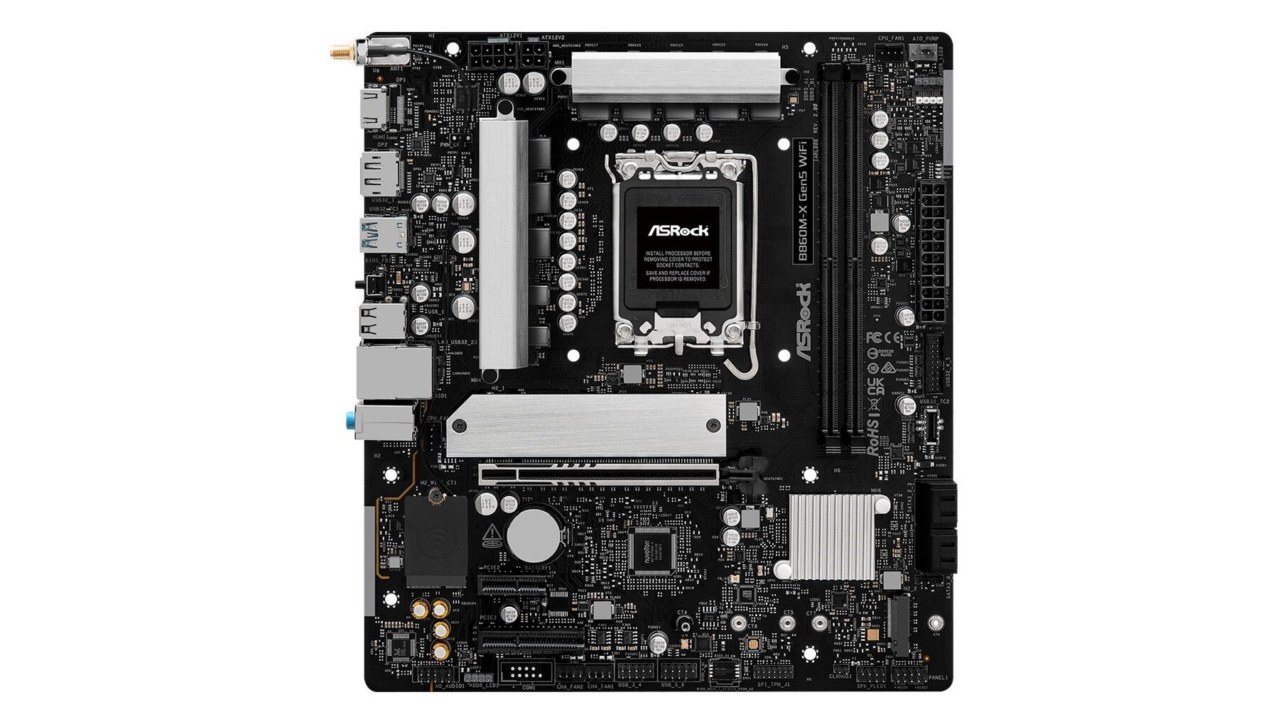 2× antenna csatlakozó, 1× HDMI, 1× DisplayPort 1.4, 1× USB 3.2 Gen2x2 Type‑C, 3× USB 3.2 Gen1, 2× USB 2.0, 1× RJ‑45 LAN, 1× BIOS Flashback gomb, 3× audio jack (Line in / Front Speaker / Mic). Az előre beszerelhető I/O shield az összeszerelés során kényelmes és pontos illeszkedést biztosít.