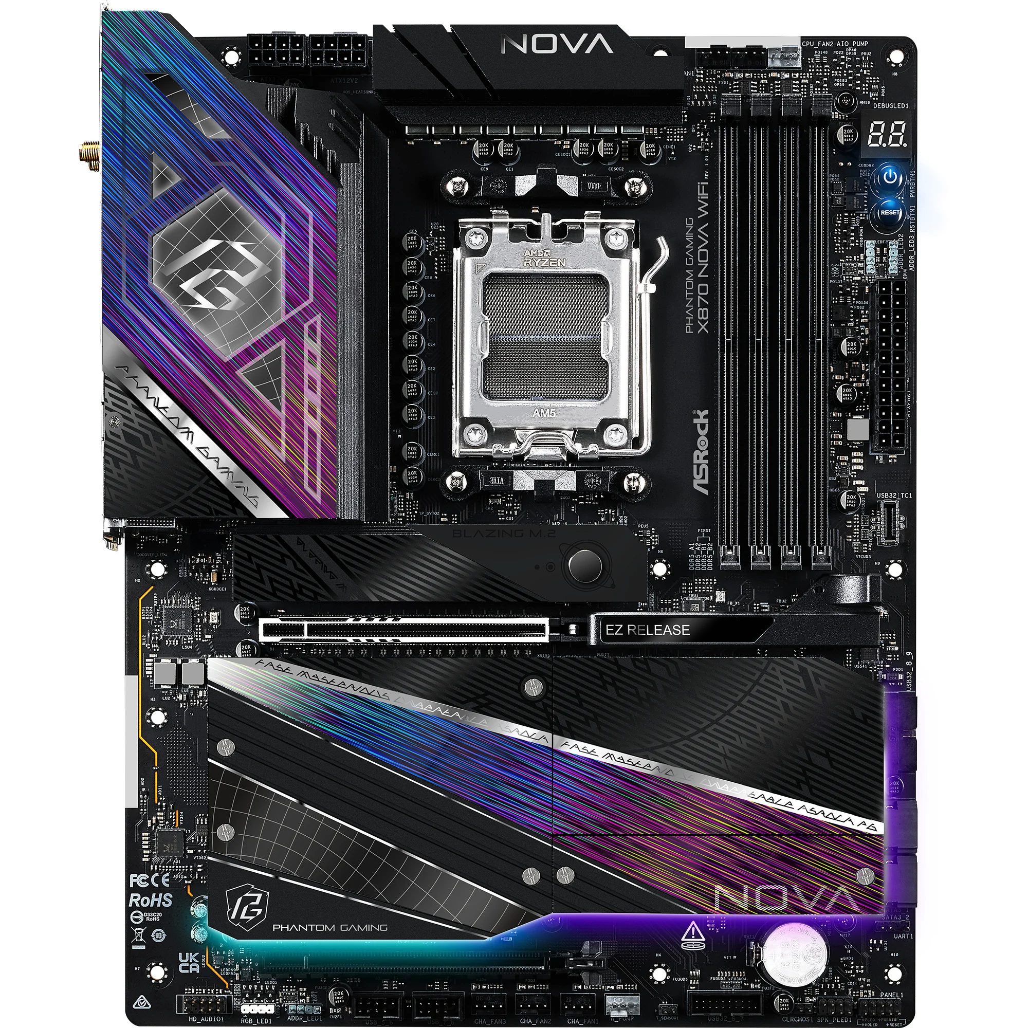 Az ASRock X870E Nova WiFi alaplap a legújabb AMD-X870E chipsetre épül, és kifejezetten az AM5 foglalatos AMD processzorok támogatására lett kifejlesztve, így biztosítva a maximális teljesítményt és stabilitást a legújabb Ryzen modellekkel.