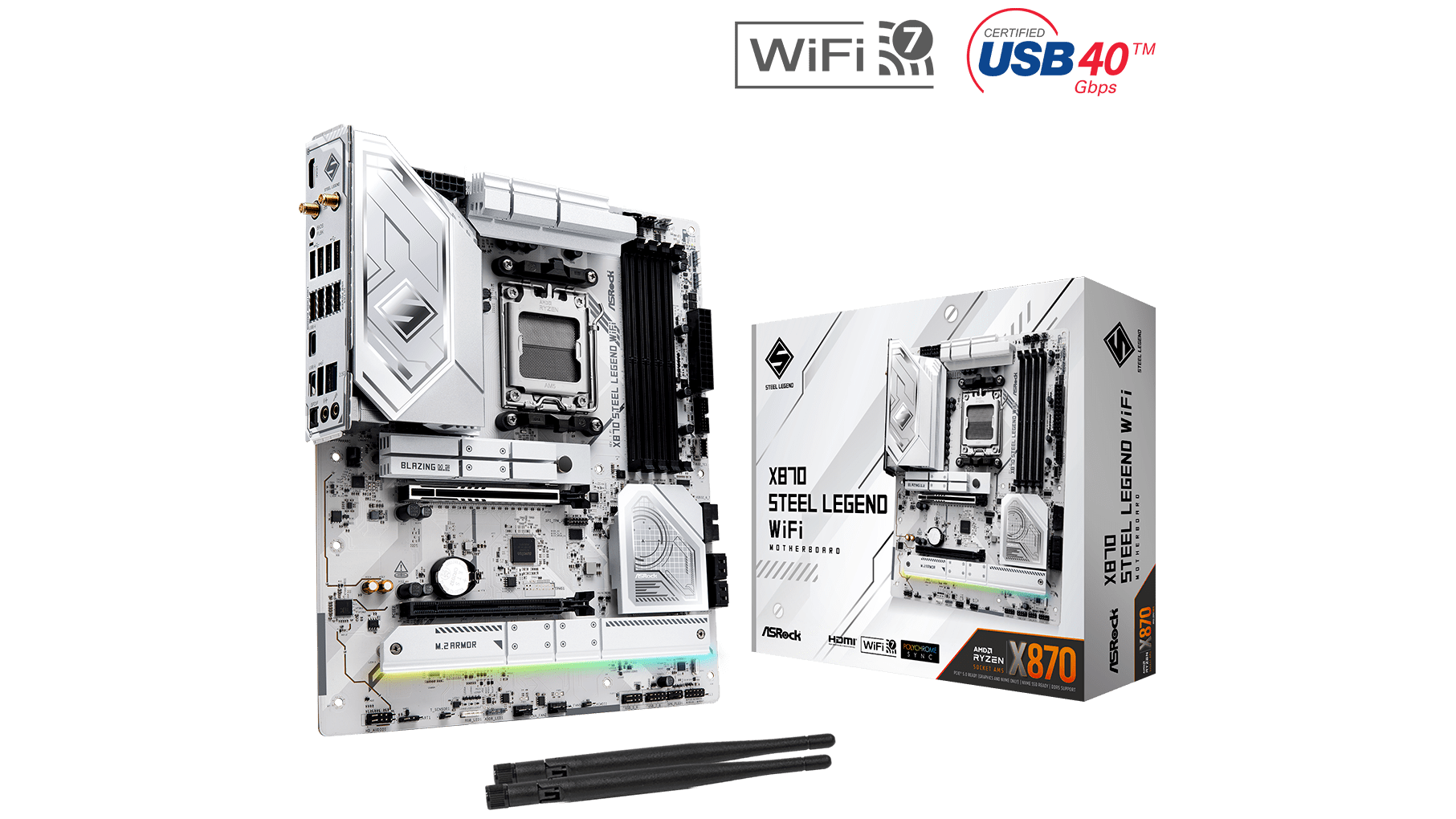 Az ASRock X870 Steel Legend WiFi büszkélkedhet egy Blazing M.2 (PCIe Gen5x4) és két Hyper M.2 (PCIe Gen4x4) csatlakozóval, hogy villámgyors adatátviteli sebességet biztosítson. Továbbá, négy SATA3 port is rendelkezésére áll.