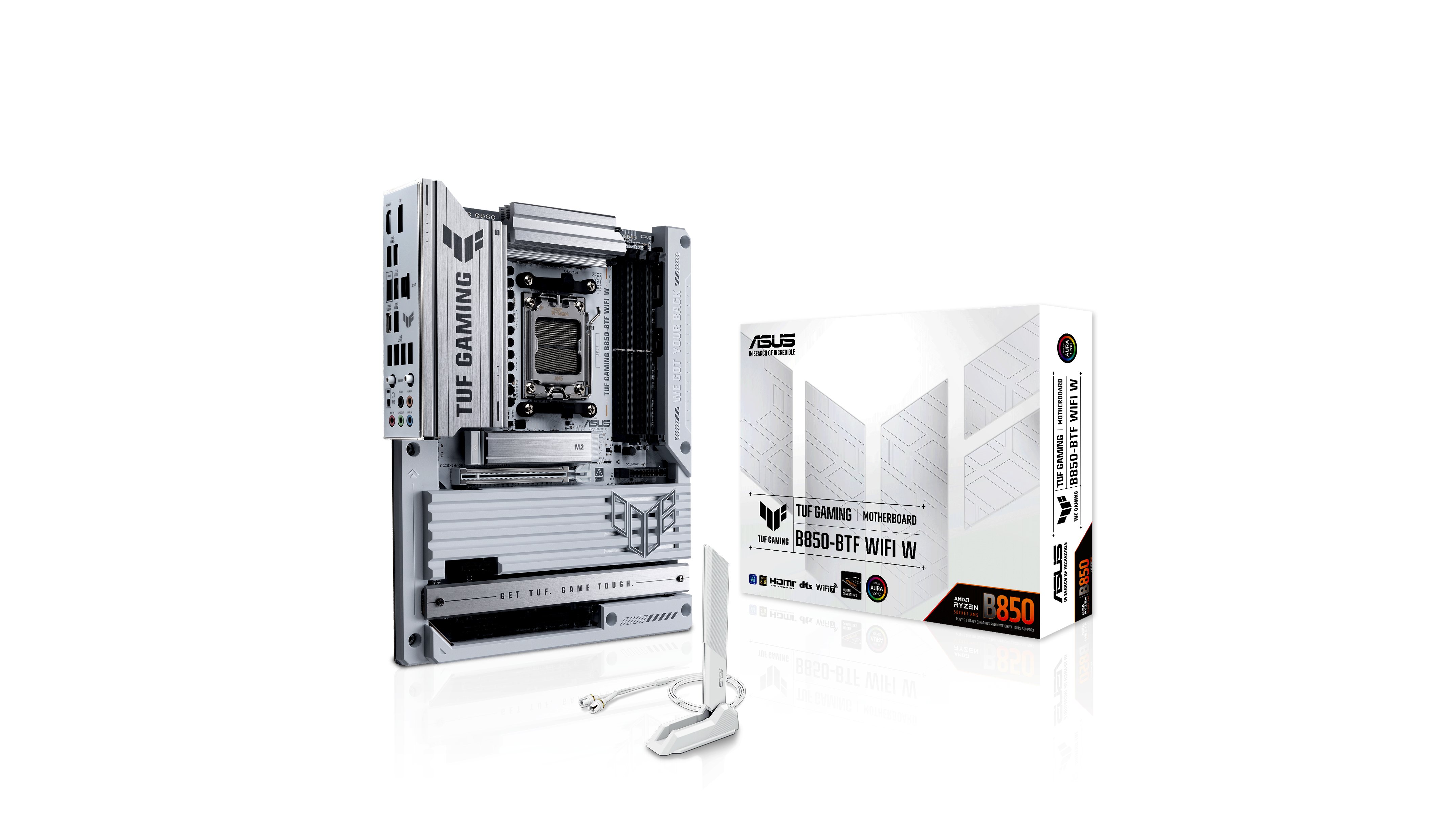 Az ASUS TUF GAMING B850-BTF WIFI W alaplap a legújabb AMD Ryzen™ processzorok minden fontos elemét egyesíti játékra kész funkciókkal és bevált tartóssággal. A "BTF" jelentése "Back To (the) Future”, amely egy új korszakot jelöl minden PC DIY gamer számára. A továbbfejlesztett BTF sorozat nem csak elrejti az összes csatlakozót az alaplap alsó felületein, de akár 600 wattot is biztosít a BTF grafikus kártyák számára egy nagy teljesítményű grafikus kártya foglalaton keresztül, így tiszta kábelkezelést és minimalista megjelenést kínál. Ez a platform biztosítja azt a teljesítményt és csatlakoztathatóságot, amit a fejlett mesterséges intelligencia alapú PC alkalmazások igényelnek.