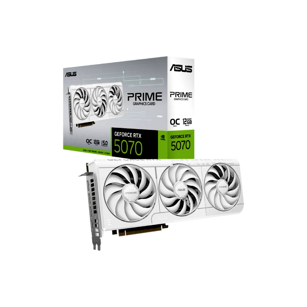 A Prime RTX 5070 fehér kiadású grafikus kártya 2,5 slotos kialakítással rendelkezik, ahol a burkolat, a hűtőborda és a hőcsövek gondosan elrendezettek. Három Axial-tech ventilátor biztosítja az optimális hőmérsékletet a ház oldallapján keresztül történő szellőzés segítségével.