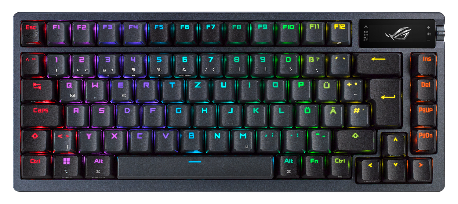A ROG Azoth egy 75%-os kiosztású gamer billentyűzet tele olyan saját módosításokat segítő funkciókkal, amelyeket hagyományosan csak a csúcskategóriás egyedi billentyűzetek szoktak kínálni. A fém felső borítás, a szilikongumi hézagkitöltő rács (gasket), a három rétegű zajcsillapítás, a gyorsan cserélhető, előre lubrikált ROG NX mechanikus kapcsolók, a billentyűstabilizátor, a ROG PBT doubleshot billentyűsapkák és a csomaghoz adott kenőkészlet mind-mind azt szolgálja, hogy fantasztikus gépelésérzetű billentyűzeted lehessen. A ROG Azothon egy OLED-kijelző is helyet kapott. Az intuitív vezérlés, a rugalmasan használható háromféle csatlakozási mód (2,4 Ghz-es rádiós kapcsolatnál a SpeedNova vezeték nélküli technológia) mellett már csak hab a tortán a háromféle beállítható magasság/szög és a MacOS támogatás.
