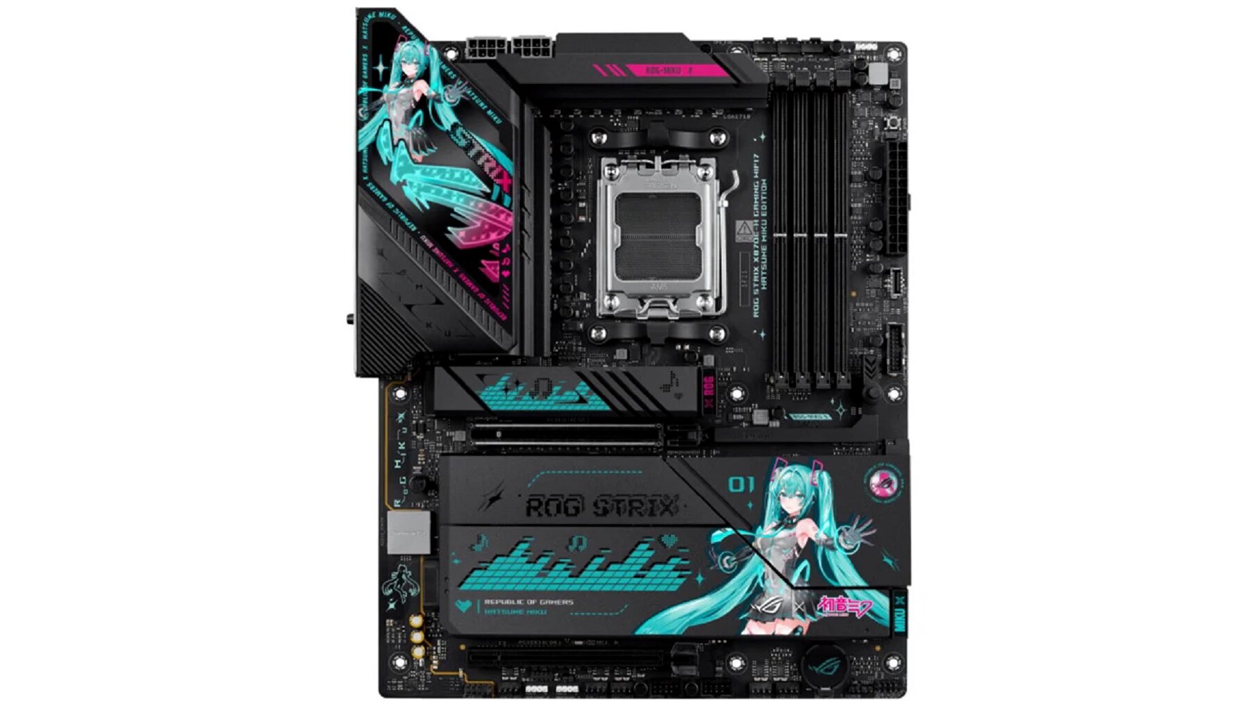 Egyedi Hatsune Miku grafika, logók és kiegészítők, AURA Sync támogatással kombinálva. 3 címezhető RGB LED header gondoskodik arról, hogy a fények harmonizáljanak a többi ROG / AURA Sync kompatibilis komponenssel.