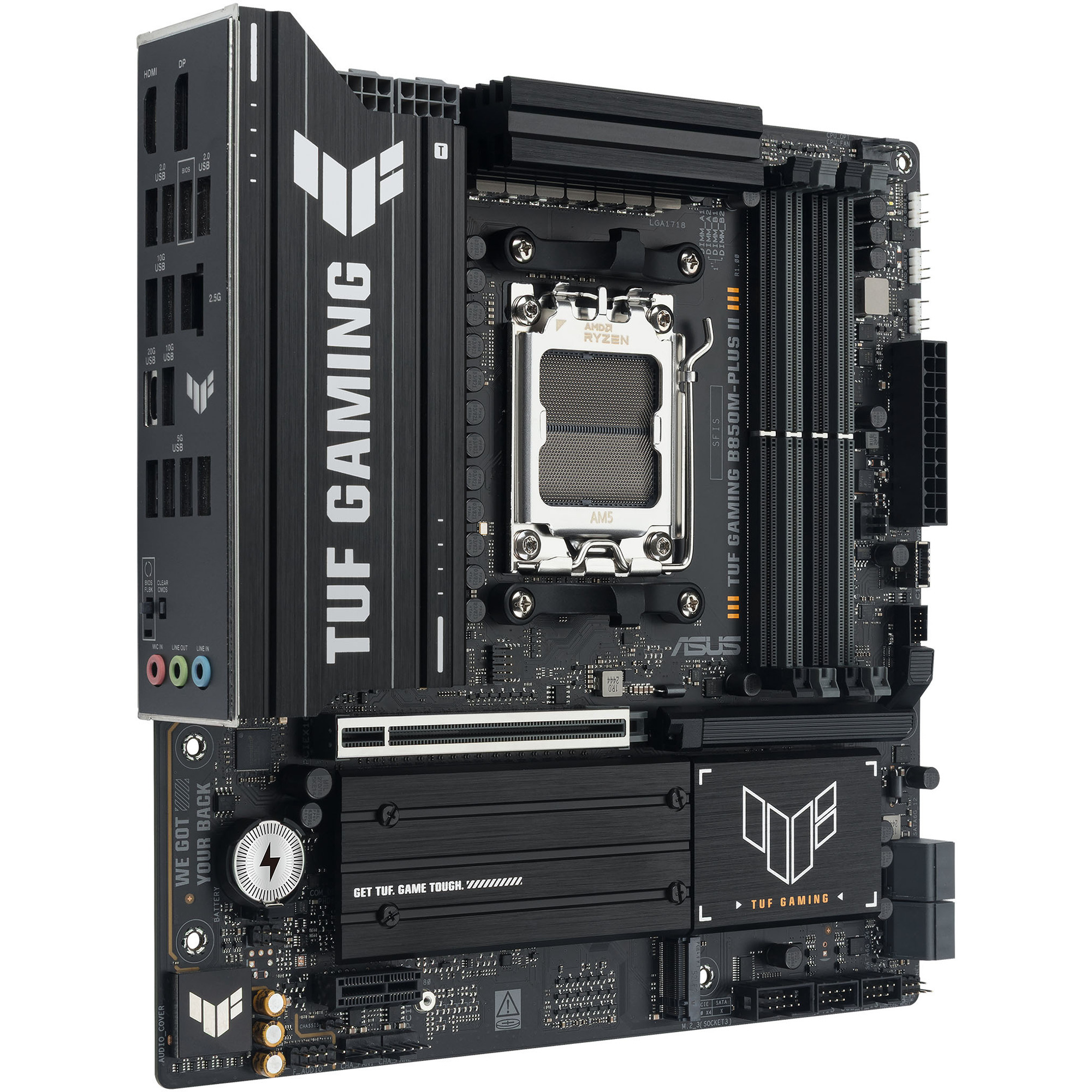 Csatlakozók: 1× USB 20 Gbps Type-C®, 3× USB 10 Gbps Type-A, 4× USB 5 Gbps Type-A, 4× USB 2.0 Type-A, 1× DisplayPort, 1× HDMI, 1× Realtek 2.5Gb LAN, 3× audio jack, 1× BIOS FlashBack™ gomb, 1× Clear CMOS gomb