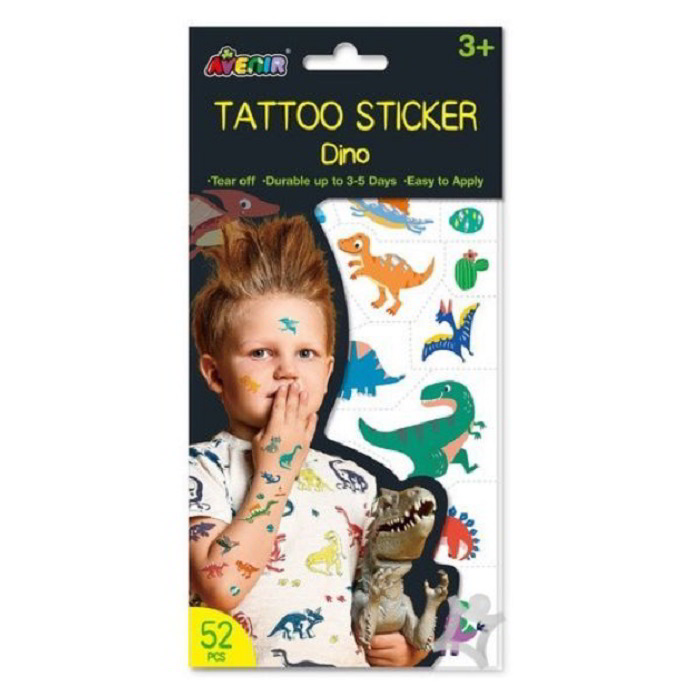 Az Avenir 52 db-os lemosható tetoválás csomagjával az őshüllő-rajongó kisgyerekek magukon viselhetik a dinoszauruszokat. A tetoválások 3-5 napig maradnak rajta a bőrön, de eltávolításuk korábban is lehetséges: vízzel és szappannal könnyen lemoshatók.
