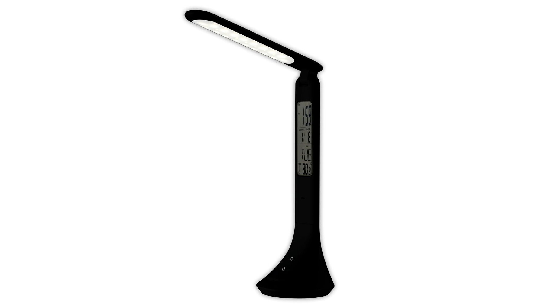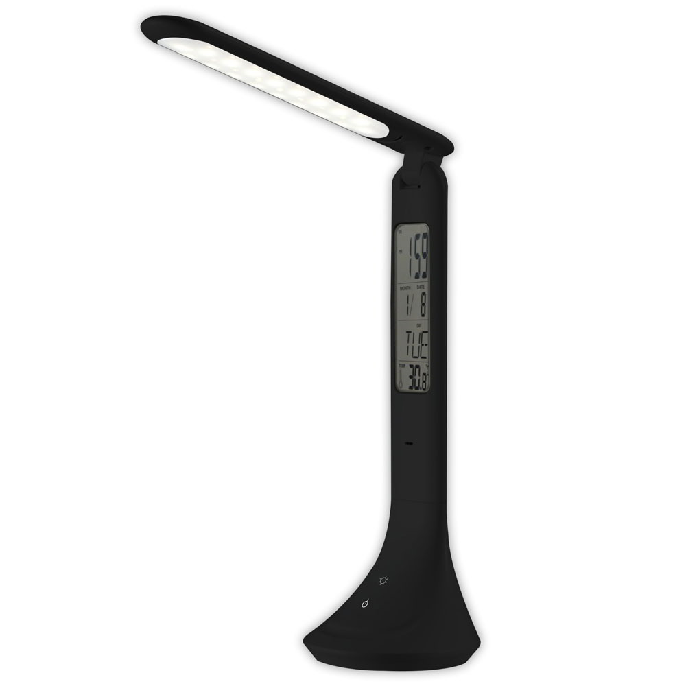 A LED asztali lámpa minimalista, fekete dizájnja harmonizál bármilyen belső térrel. A lámpa testében integrált naptár és óra még praktikusabbá teszi napi használatát. A naptár kijelző mindig pontosan mutatja az aktuális dátumot, így soha nem fog lemaradni egy fontos eseményről vagy találkozóról.