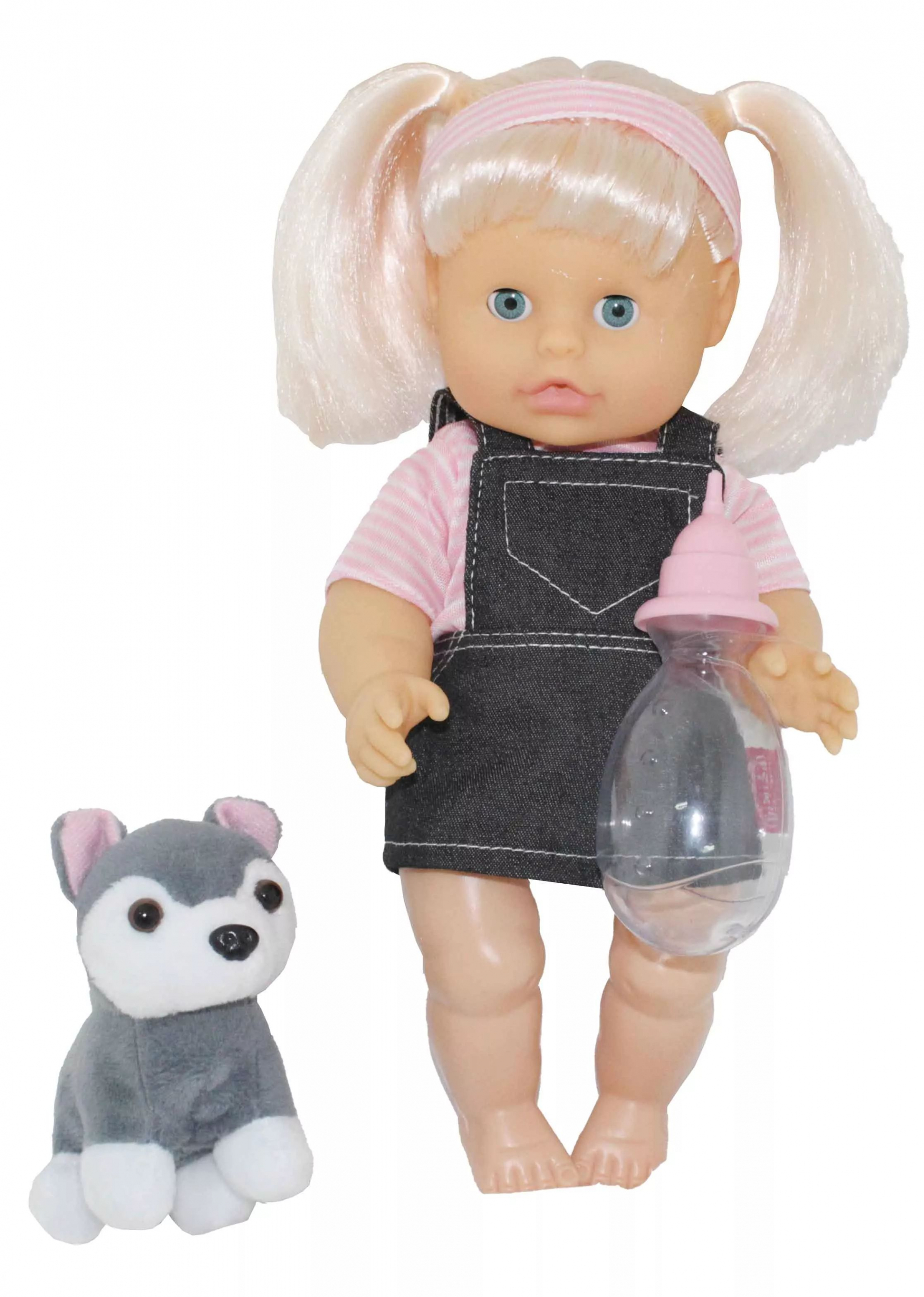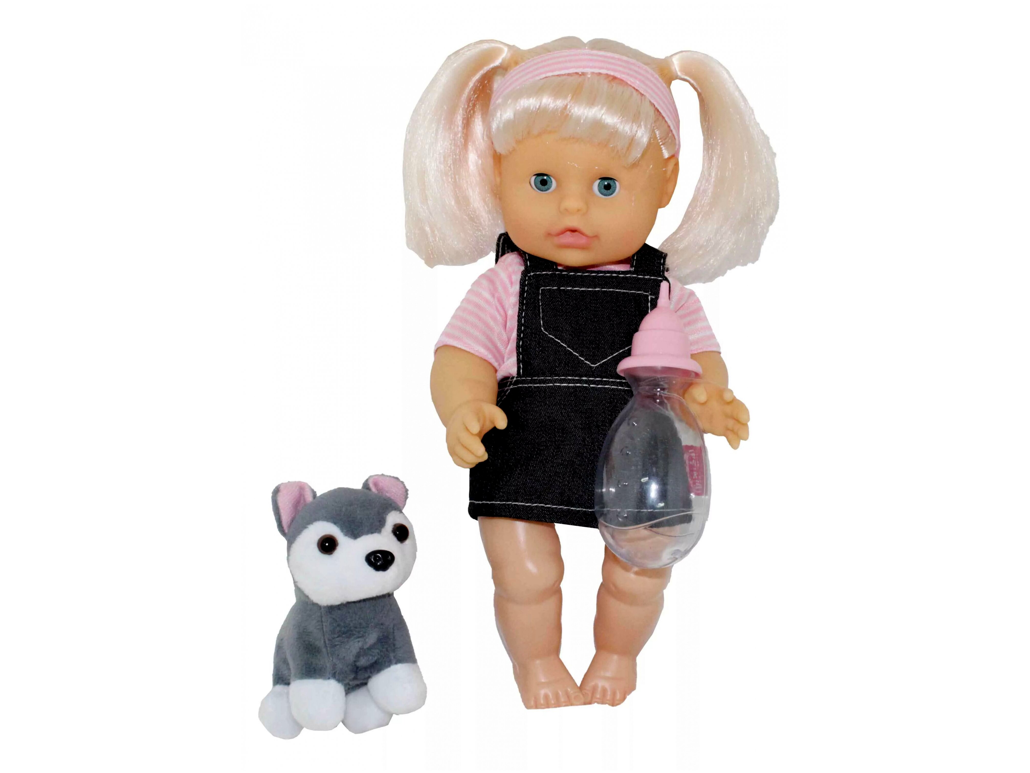 Ezzel az aranyos, fekete farmerszoknyát viselő babával a kislányok kipróbálhatják, milyen anyukának lenni. A kb. 36 cm-es babának oldalsó copfokba van fogva a haja, arca aranyos kidolgozású, felsője rózsaszín csíkos. A babához egy cumisüveg és egy játékkutya is tartozik.