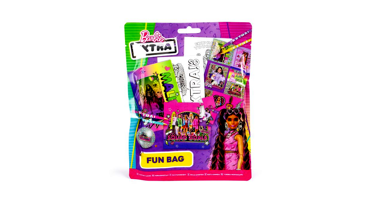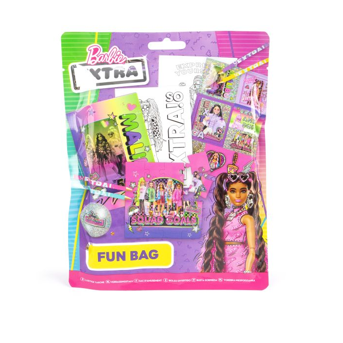 Barbie témájú matricák, színező, egy mini kirakó, színes ceruzák és pattogós labda vidám tasakban.
