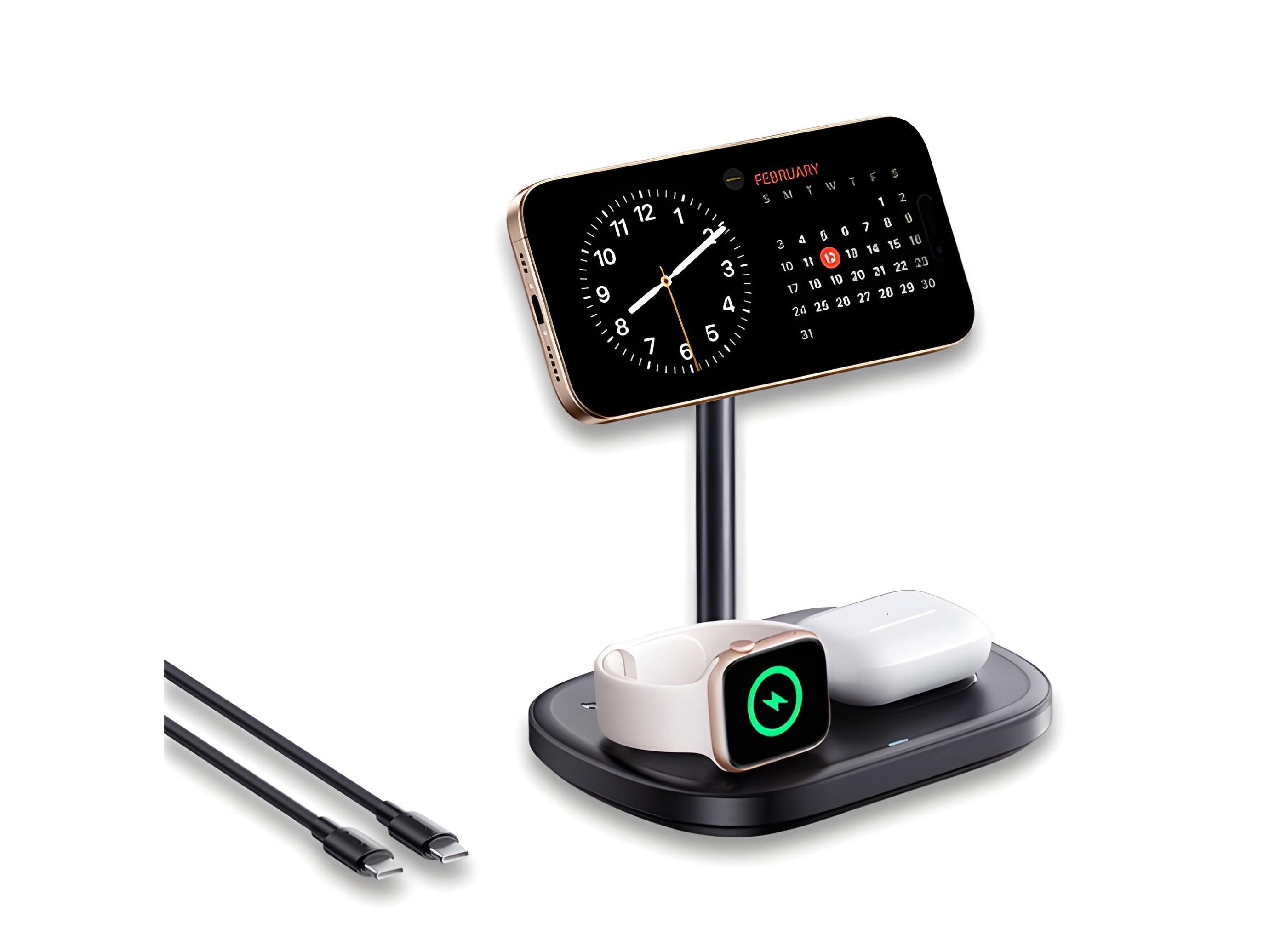 A dönthető MagSafe telefontartóval a készülék töltés közben is kényelmesen használható – videóhívásokhoz, üzenetíráshoz vagy tartalomfogyasztáshoz nem kell a telefont kézben tartani. A mágneses rögzítés pontosan a megfelelő pozícióba igazítja a készüléket, ezzel biztosítva az optimális töltési hatásfokot. Az okosóra és a fülhallgató külön töltőfelületei segítenek abban, hogy minden eszköznek meglegyen a saját, rendezett helye.