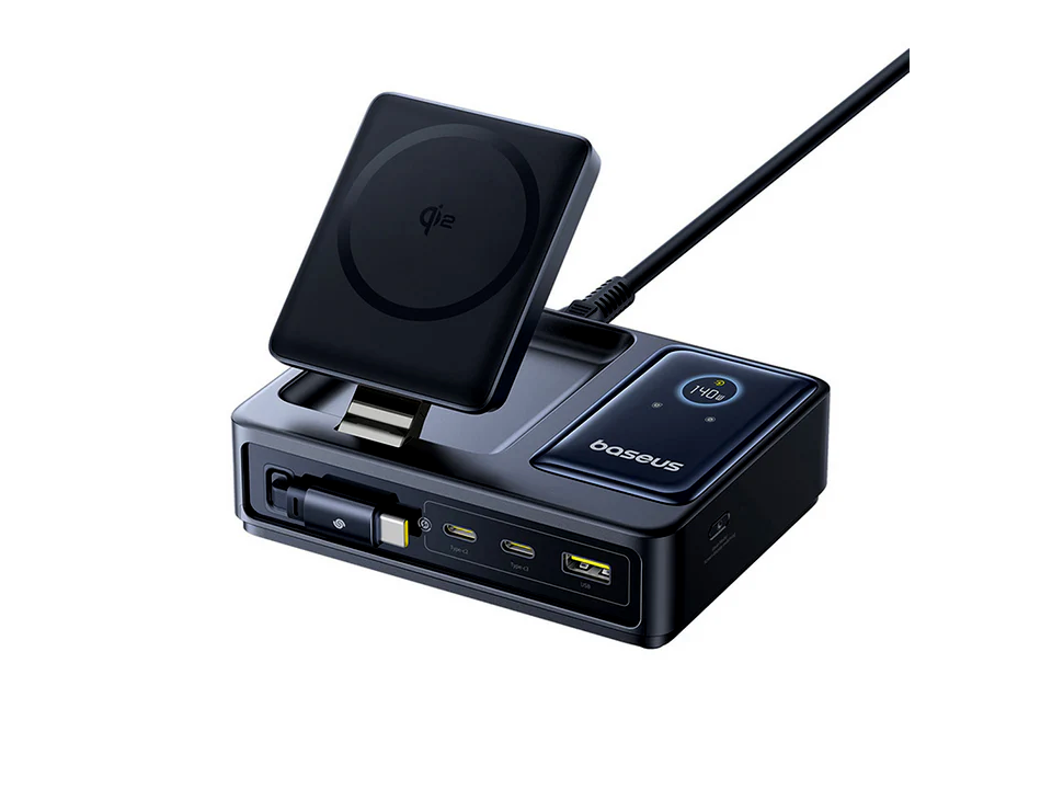 - Multi 5-az-1-ben kialakítás – egyszerre tölthetsz vezetékes és vezeték nélküli eszközöket: beépített 100 W-es kihúzható USB-C kábel + 2× USB-C port + 1× USB-A port + mágneses Qi2 vezeték nélküli felület