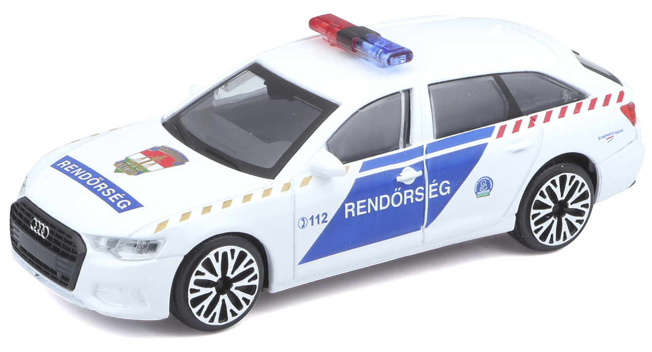 Fehér és kék színű rendőrautó, magyar Rendőrség felirattal - hogy egyetlen bűnöző se pattanhasson meg a gyerekszobából. Ez az 1:43 méretarányú Bburago Audi A6 Avant autó fémből és műanyagból készült autómodell gyerekeknek és gyűjtőknek egyaránt remek ajándék lehet. Az autó Rendőrség felirattal és a 112 hívószámmal van díszítve, és pont úgy néz ki, mint az igazi kombi Audi rendőrautók.