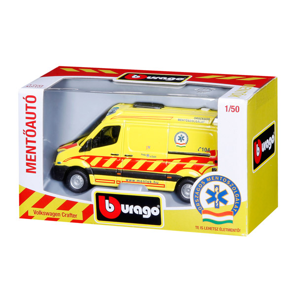 Fémből készült, sárga színű Bburago magyar mentőautó - Volkswagen Crafter 1:50 méretaránnyal. A mentőautó az Országos Mentőszolgálat logójával, országos hívószámával, a 104-gyel van ellátva, és megszólalásig hasonlít az eredeti, utcákon látható Országos Mentőszolgálat Volkswagen Crafter mentőautóira. A kisautó felszereléssel is el van látva, együtt használható a Bburago 1:50 méretarányú pályákkal is. A csomagolásban helyet kapott egy kis tájékoztató is, ami a gyermekeknek az elsősegélynyújtáshoz ad útmutatást. Méretek: 12 x 5 x 5 cm.