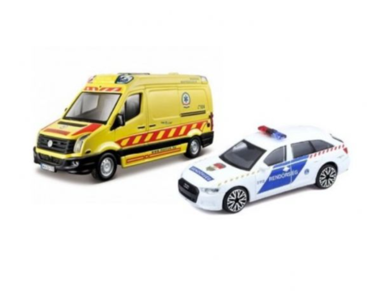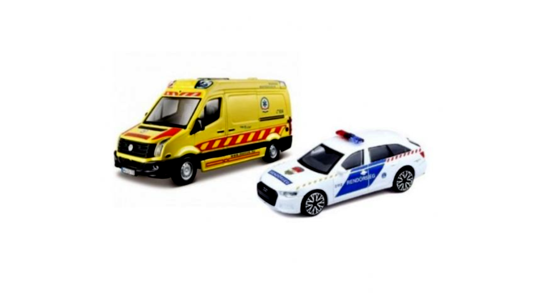 - Két jármű egy készletben: Az egyik egy Volkswagen Crafter mentőautó, a másik pedig egy Audi A6 rendőrautó.