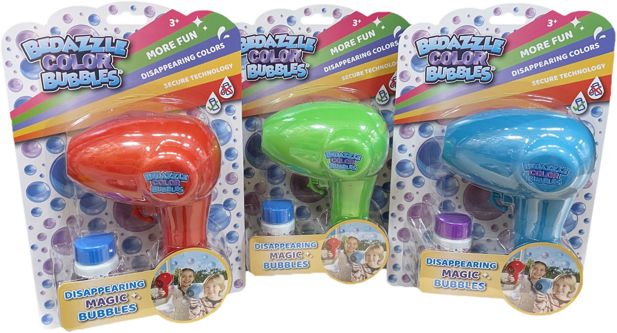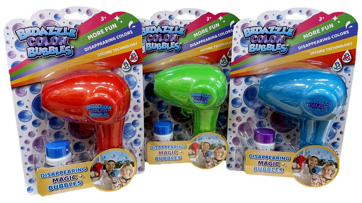 A Bedazzle Color Bubbles buborékfújó egy különleges bubifújó, amivel a gyerekek színes buborékokat lőhetnek ki. Nincs is más dolguk, csak betárazni a fegyverüket a lila vagy a kék színű folyadékkal és már lőhetik is a színes bubikat. Az új technológiával már amiatt sem kell aggódni, hogy a buborékok nyomot hagynak a ruhán! A csomagolás tartalmazza a buborékfújó pisztolyt, és egy tégely 30 ml-es folyadékot is. Színek: kék, piros és zöld.