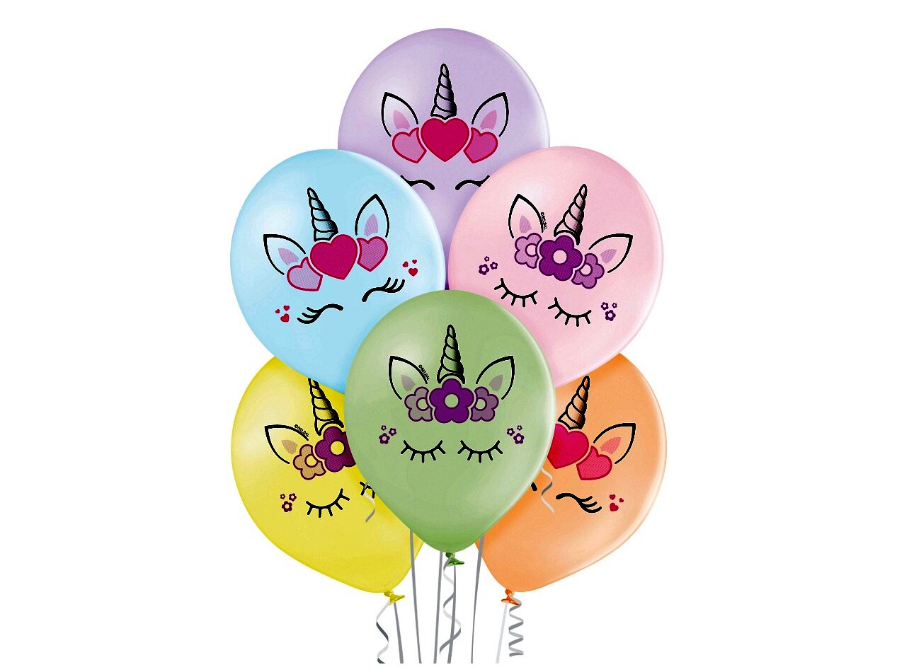 Prémium minőségű, pasztell színű léggömbök gyönyörű unikornis fejjel mintázva. A lufik anyaga természetes latex anyagból készültek.