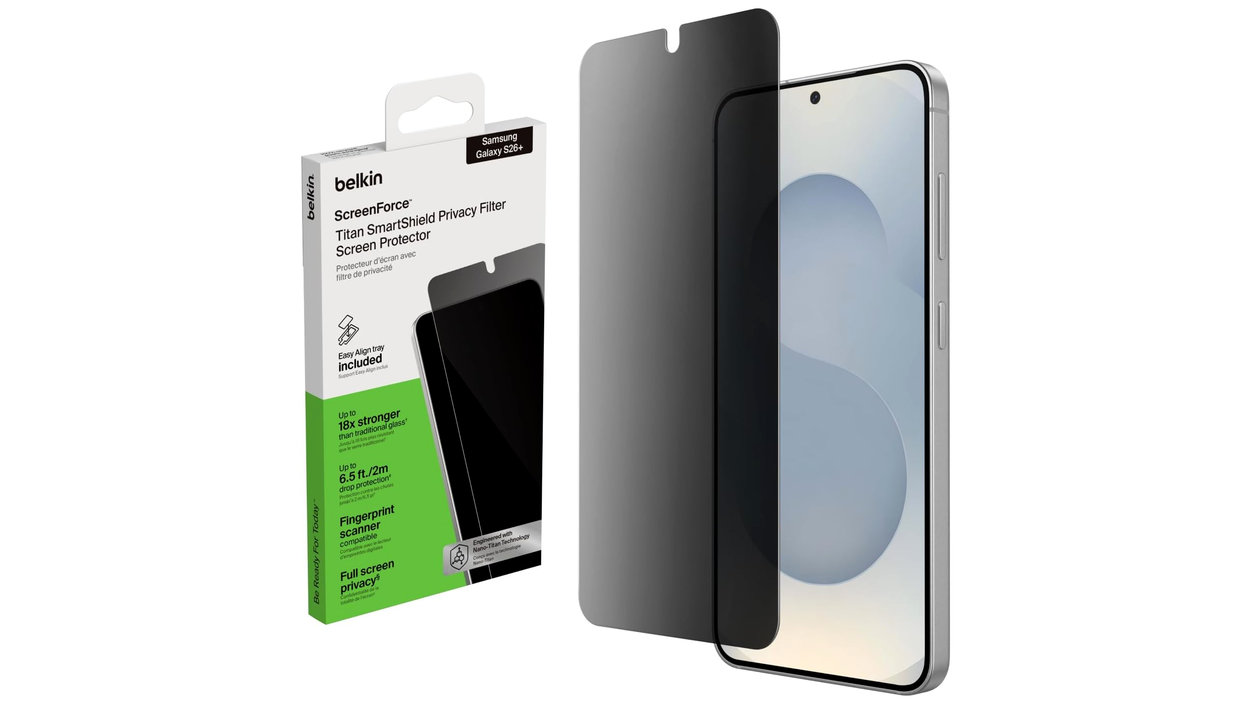 A Belkin legújabb nano-titán technológiára épülő, kétirányú privát kijelzővédő fóliája kifejezetten a Samsung Galaxy S26+ okostelefonhoz készült. A fejlett Titan SmartShield üveg technológia és a 2-way privacy réteg kombinációja egyszerre óvja a készüléket az ütésektől és karcoktól, miközben megakadályozza, hogy a körülötted lévők belássanak a kijelződre.