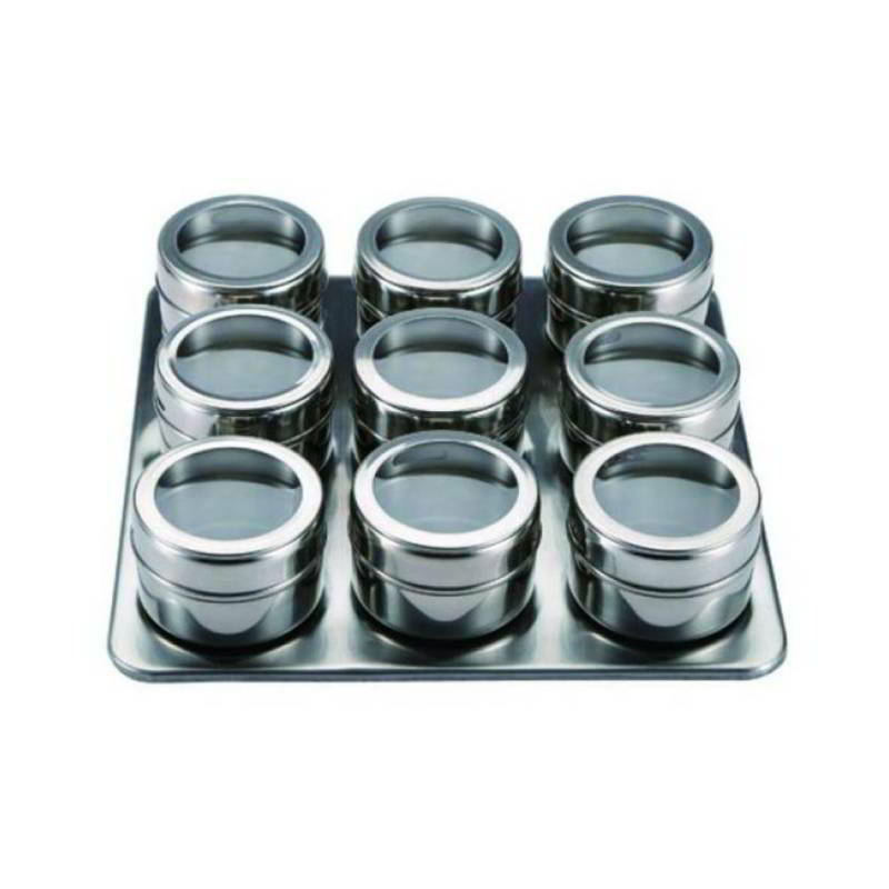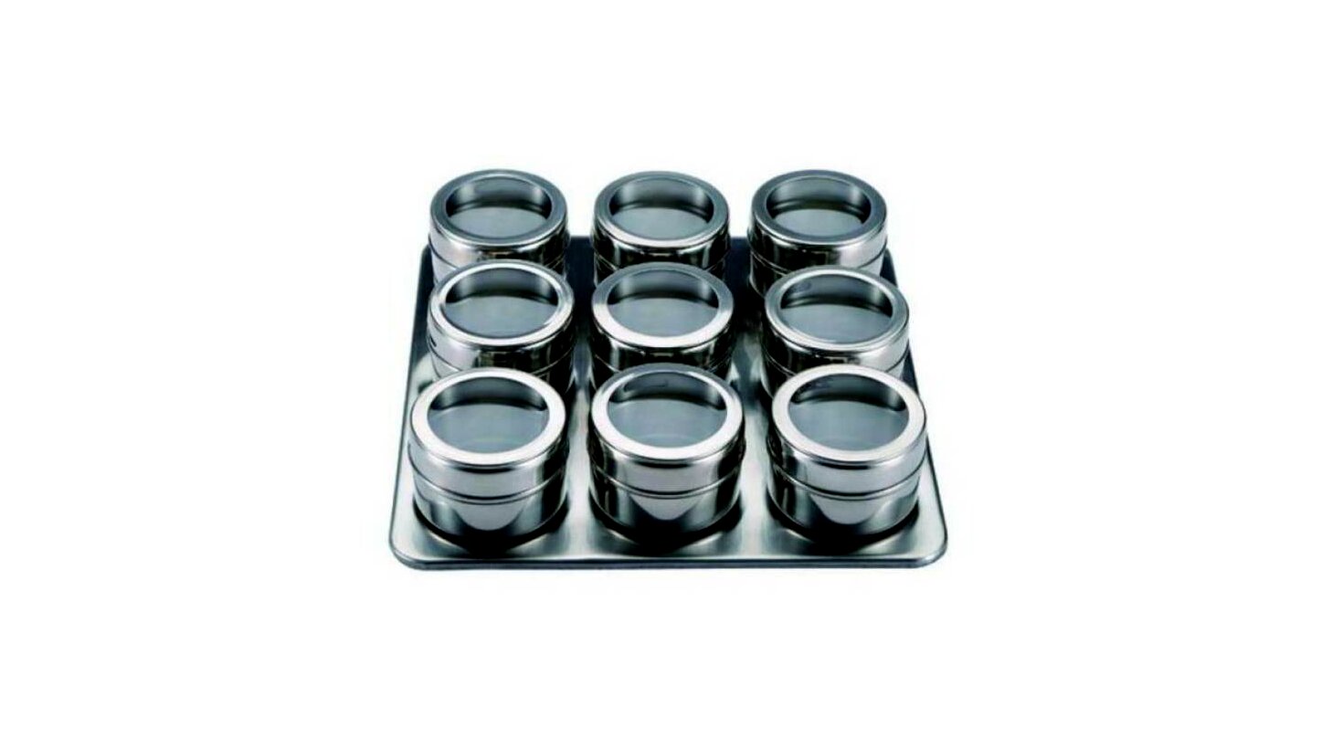 Rozsdamentes acél fűszertartó. 9db üvegcse 6.3x4.3cm méretben és egy tartó.