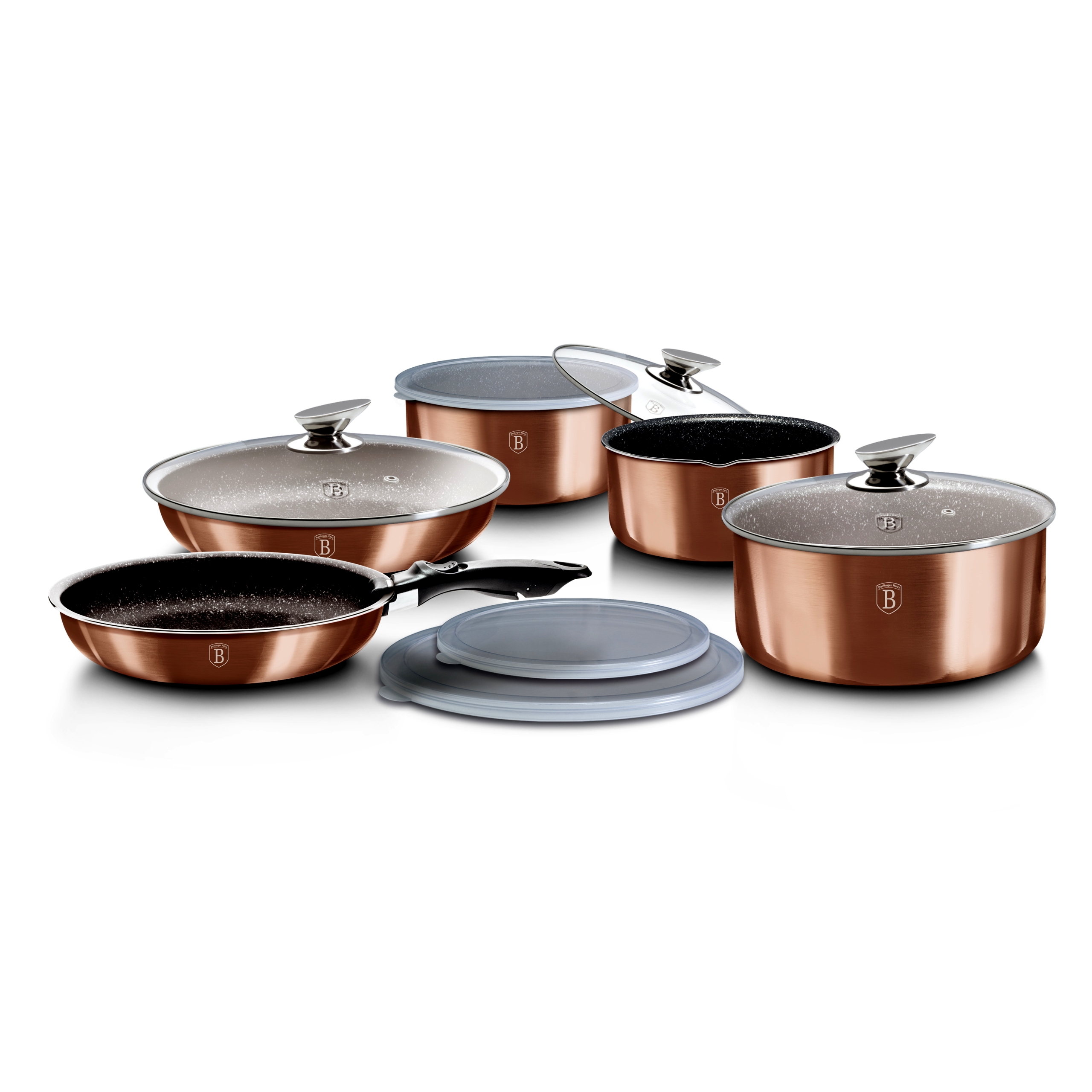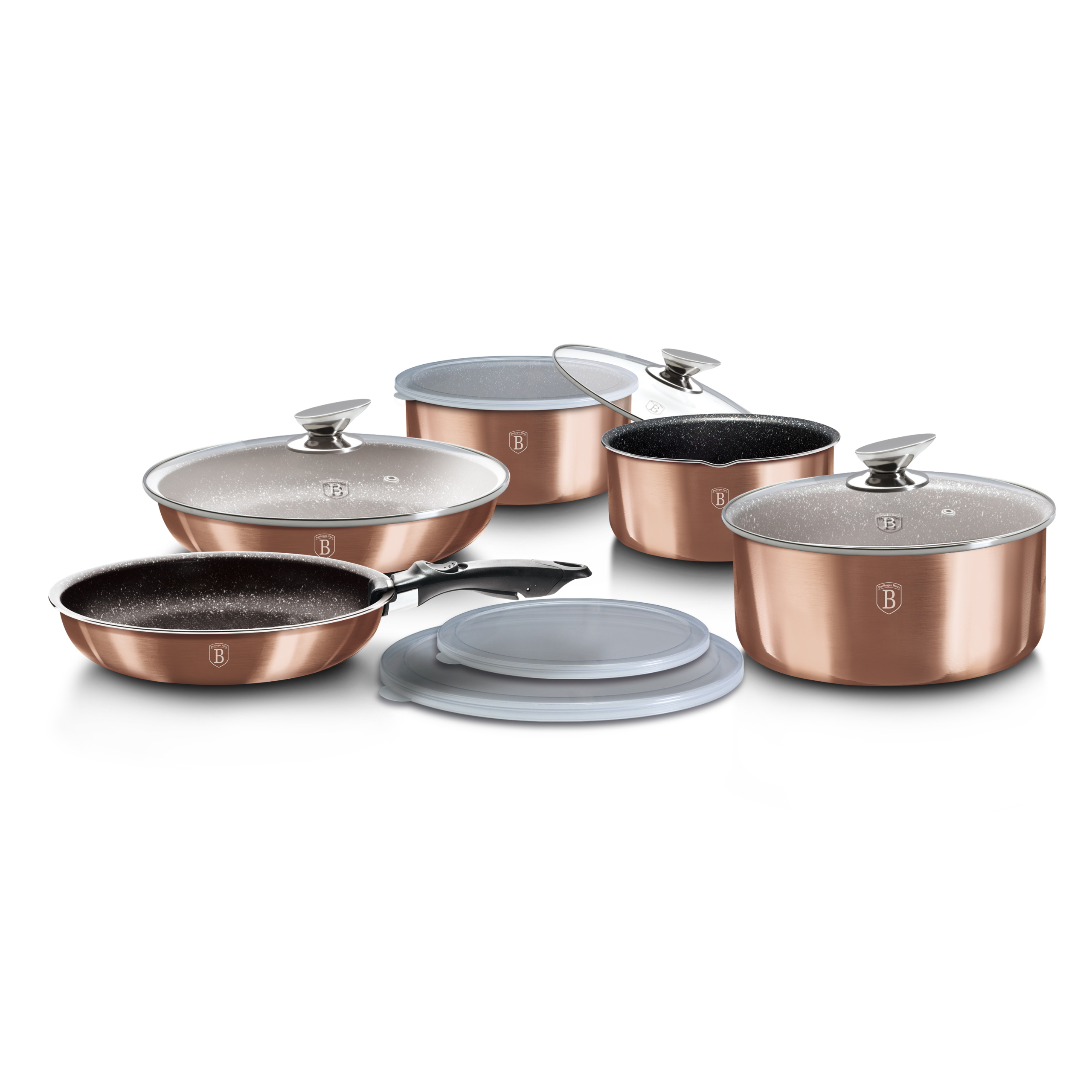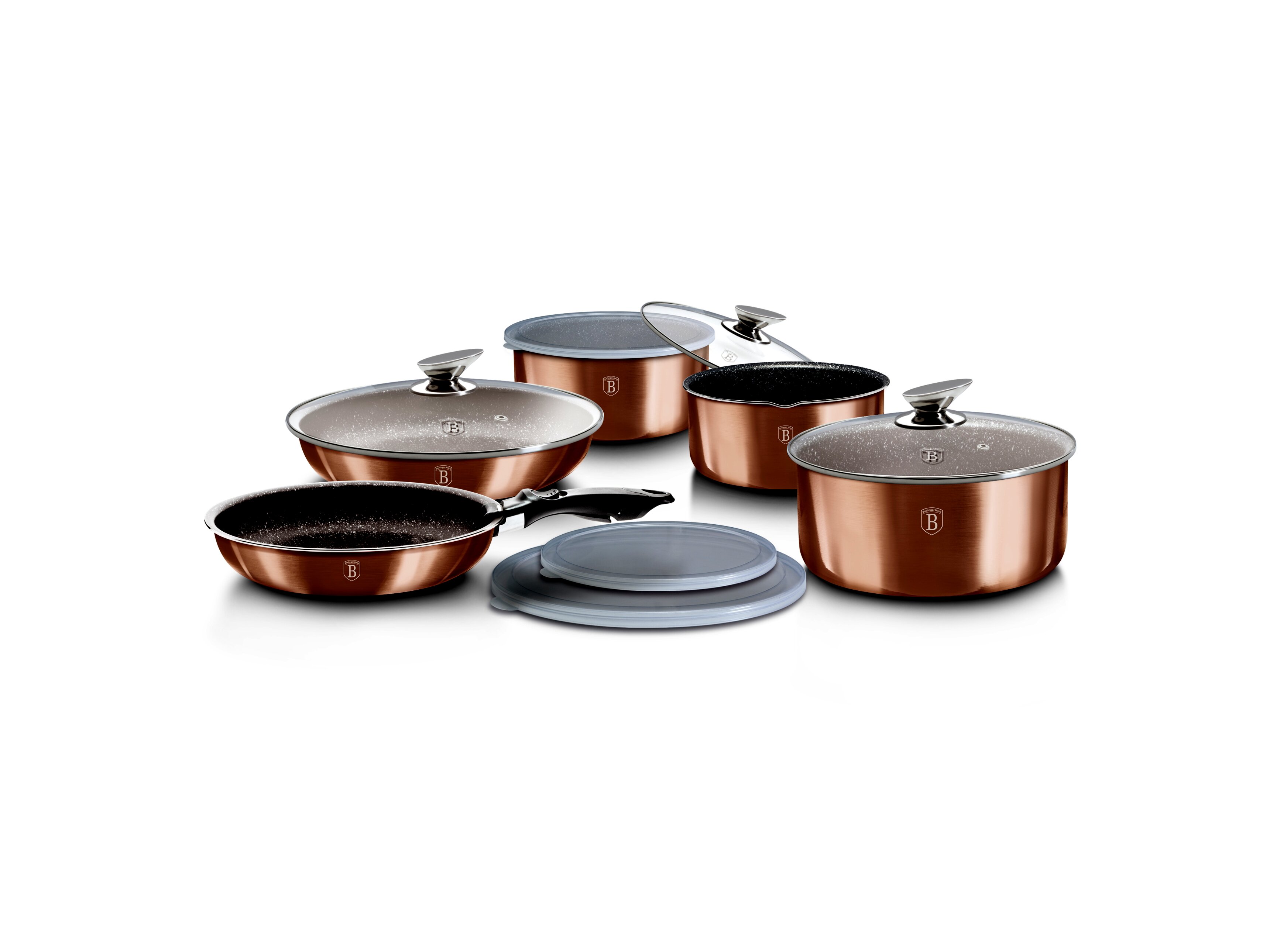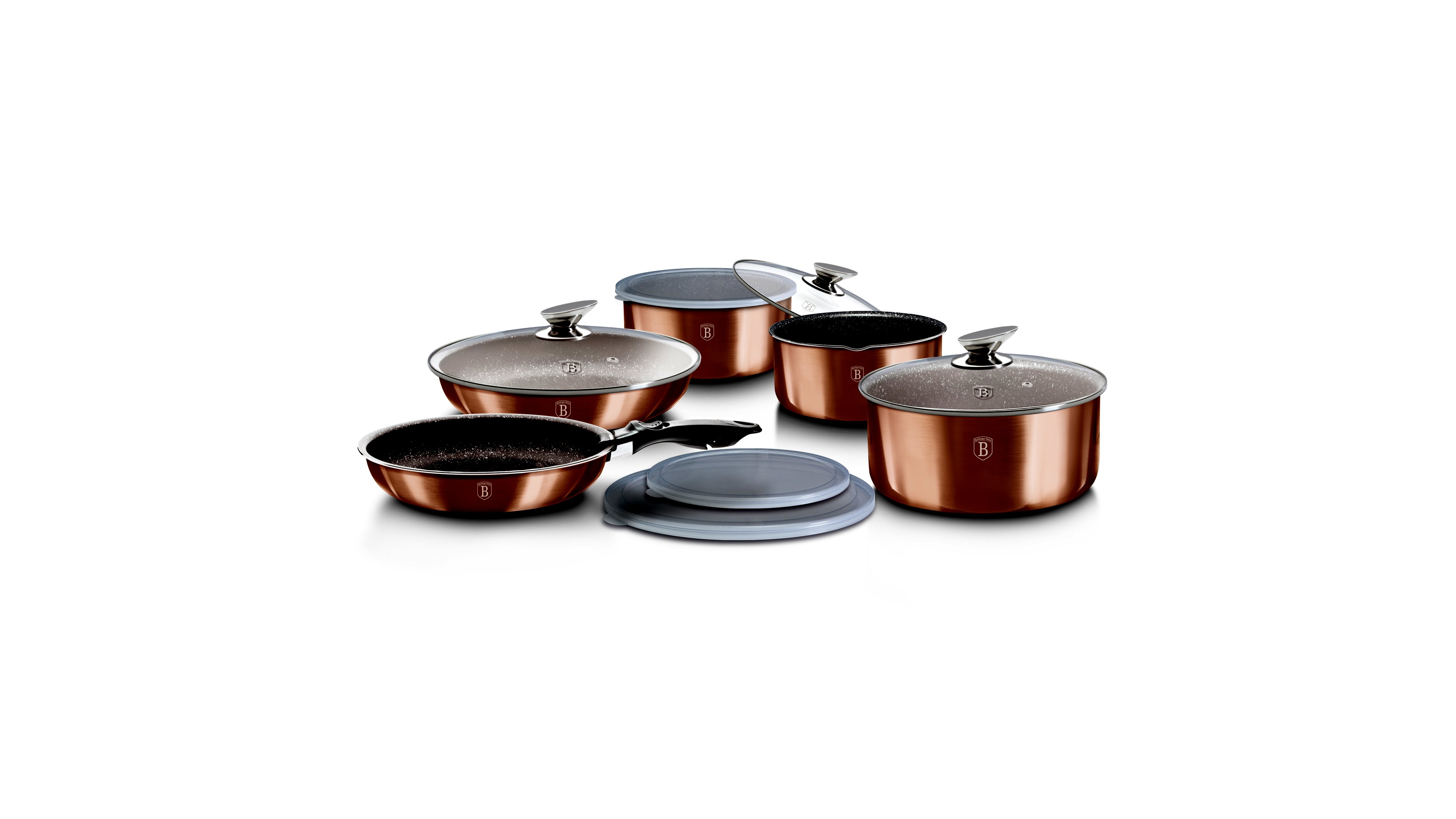 A metálfényű külső bevonat és a rose gold árnyalat a mai trendeket követi, így a készlet nemcsak használati tárgy, hanem látványos konyhai dekoráció is. Nyitott polcokra, fali akasztóra helyezve mutat igazán elegánsan.