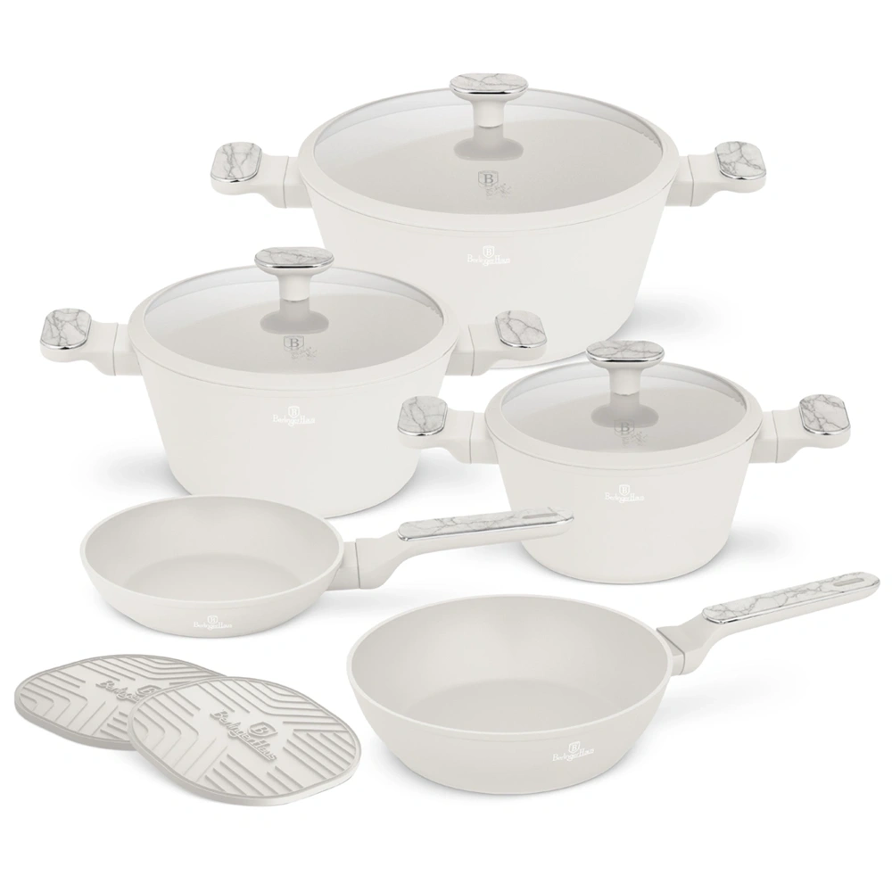 Ez a 10 részes, prémium minőségű edénykészlet a kifinomult megjelenést ötvözi a magas szintű funkcionalitással. Matt krémszínű külső, Sahara márványhatású dizájn és puha, golyós textúrájú fogantyúk gondoskodnak róla, hogy a főzés ne csak praktikus, hanem látványos élmény is legyen.
