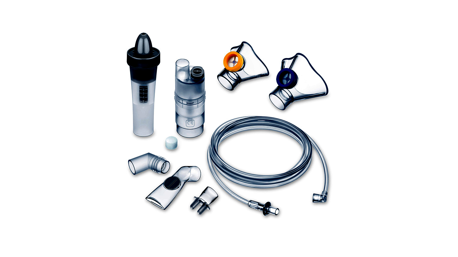 1 x szájrész | 1 x orr-rész | 1 x orrzuhany | 1 x szilikon felnőttmaszk | 1 x szilikon gyermekmaszk | 1 x könyökdarab | 1 x porlasztó | 1 x sűrítettlevegő-tömlő | 10 x szűrő